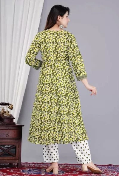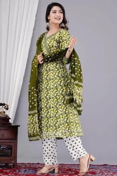 The V Neck design of the Kurta adds a contemporary and flattering touch to the set, providing a stylish canvas for the intricate printed pattern. The set includes a thoughtfully designed Kurta, a coordinating Pant, and an elegant Dupatta, all meticulously crafted from the same high-quality Cotton fabric to ensure a seamless and coordinated look.