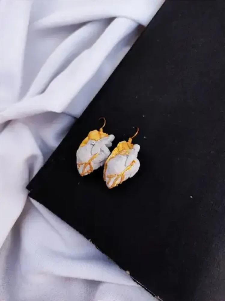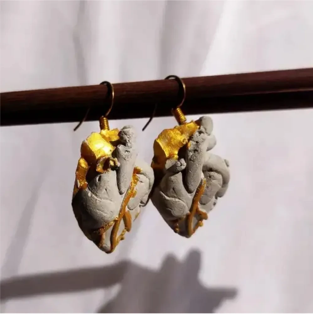 Introducing our exquisite Surgical Heart Earrings, meticulously handcrafted from cement. Each heart features vibrant colors and delicate golden veins, making every pair unique. These earrings combine durability with elegance, showcasing artisanal craftsmanship and attention to detail. Perfect for adding a bold, artistic touch to any outfit.