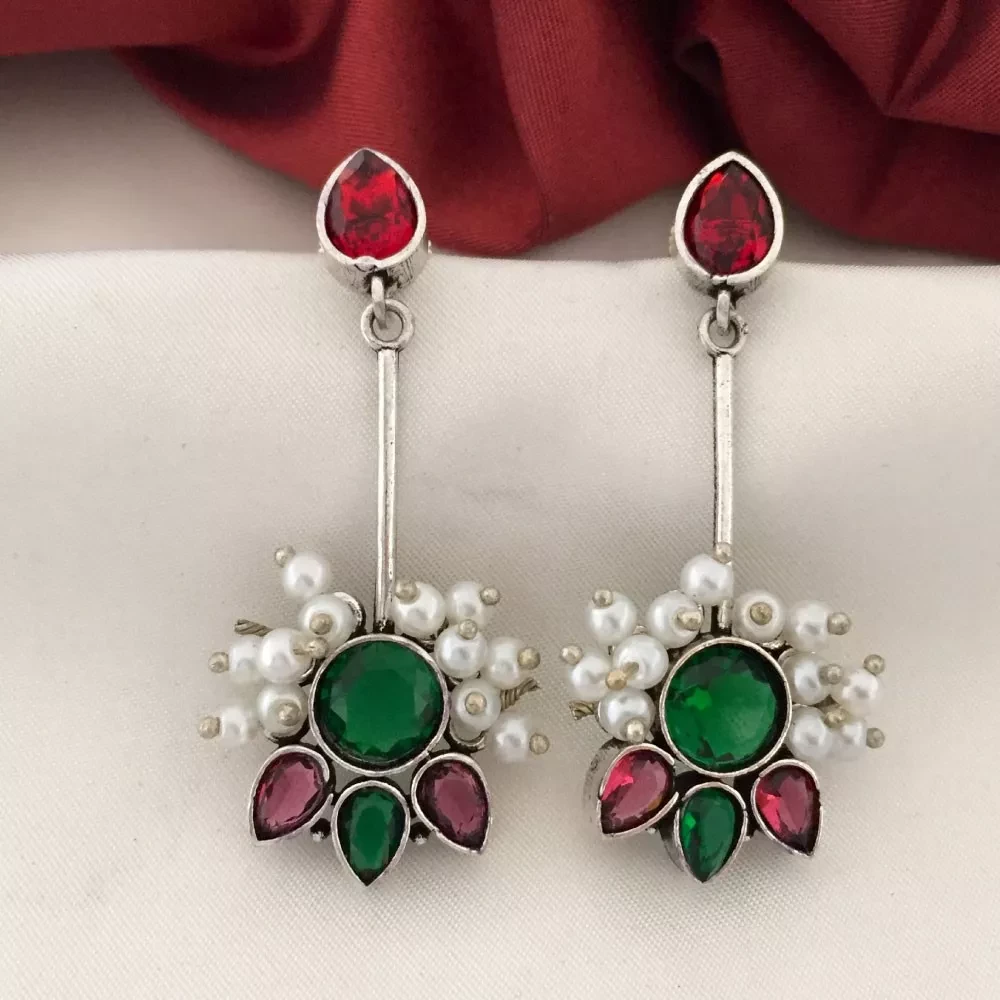 Material: The earrings are meticulously crafted from high-quality oxidised metal, ensuring durability and a lasting antique finish. The vibrant red and green thread work is complemented by the lustrous pearl, creating a stunning visual contrast.