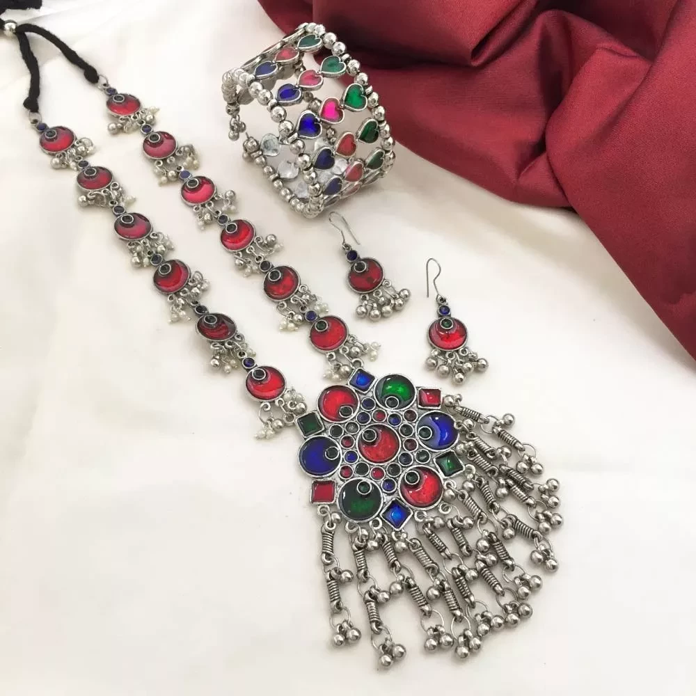 This beautiful set features a long Haram necklace, a matching bracelet, and a pair of earrings, all crafted in oxidized metal for a touch of vintage elegance. The rich, dark finish adds a dramatic flair to any outfit, while the intricate details on the haram necklace will surely turn heads.