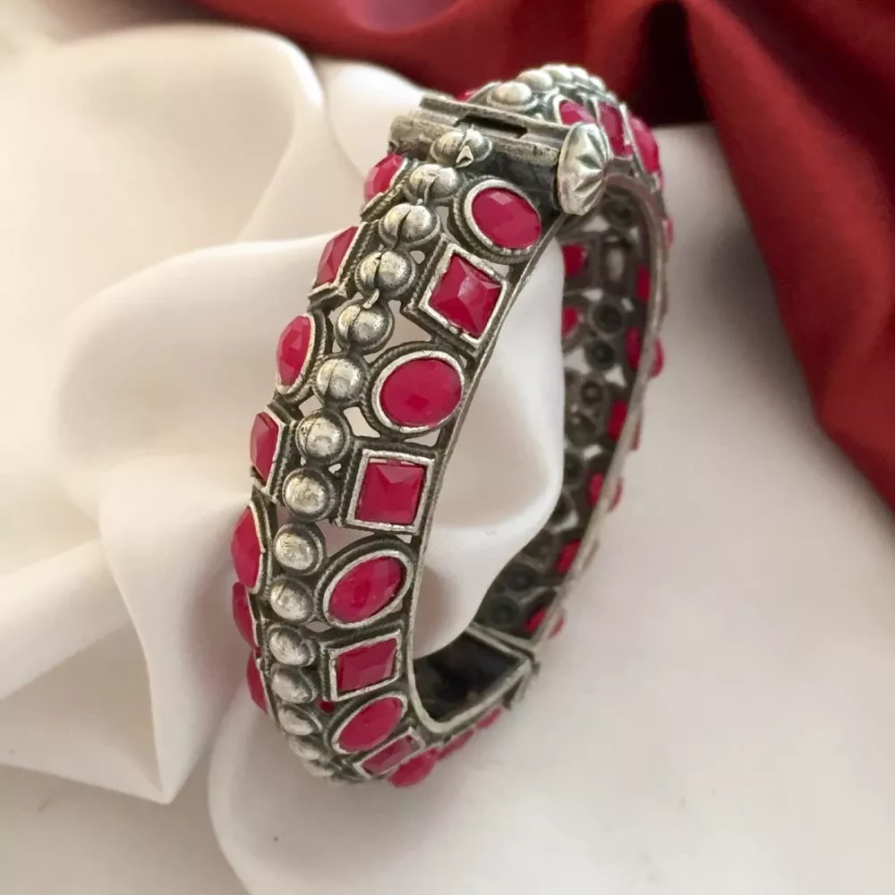 Red Stone Oxidised Brass Bracelet Kada Silver finish