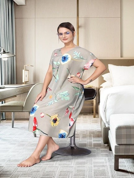 With a Below Knee length, this nighty offers both comfort and a touch of allure, ensuring you enjoy a restful night's sleep in style. Elevate your nights with the perfect blend of comfort and fashion. Embrace the sophistication of our Printed Nighty For Women in the versatile Grey shade, and make every bedtime a luxurious and stylish affair.