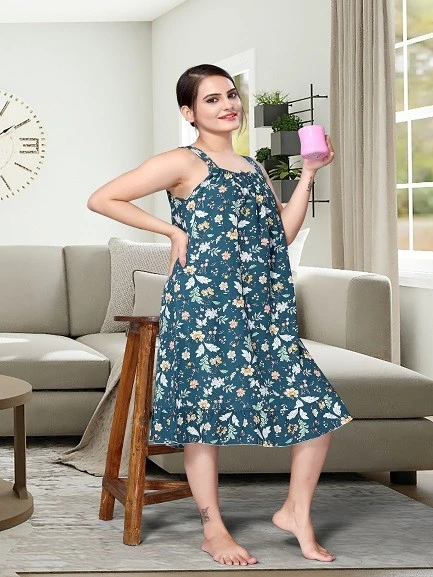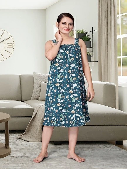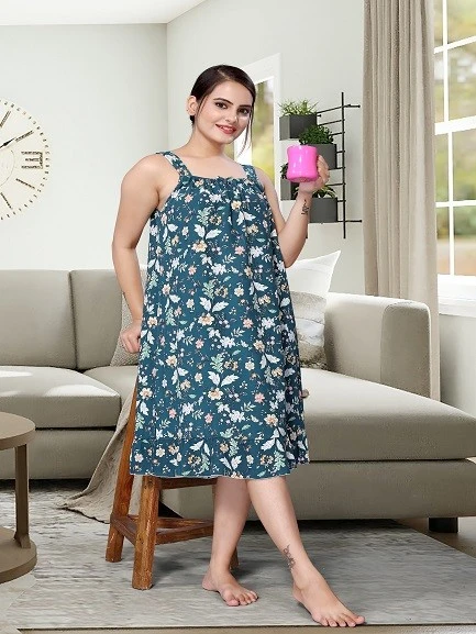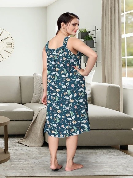 Introducing our Trendy Blue Printed Nighty, a perfect addition to your nightwear wardrobe. Made from luxurious Viscose Rayon, this nighty seamlessly blends style and comfort. Here's a detailed breakdown of its key features:
