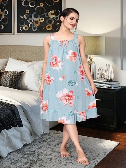 Viscose Rayon Womens Casual Dresses Summer Womens Fashion Casual Sleeveless Square Neck Sky Blue Print Casual night suit