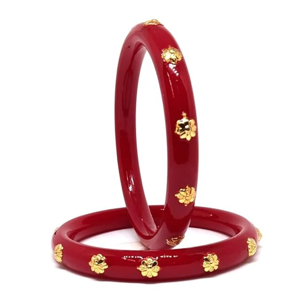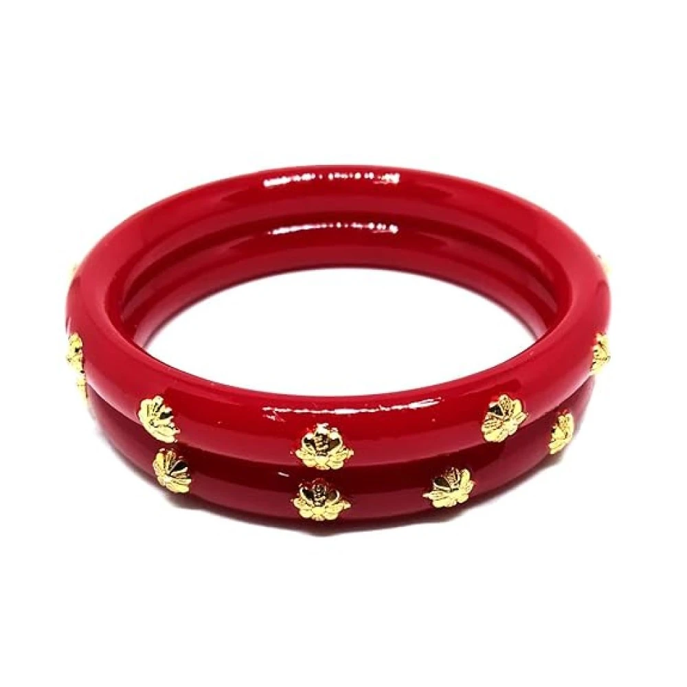 Add a touch of elegance and tradition to your look with these Gold Plated Pola Bangles. These bangles are made of high-quality plastic and coated with a layer of gold for a shiny and durable finish.