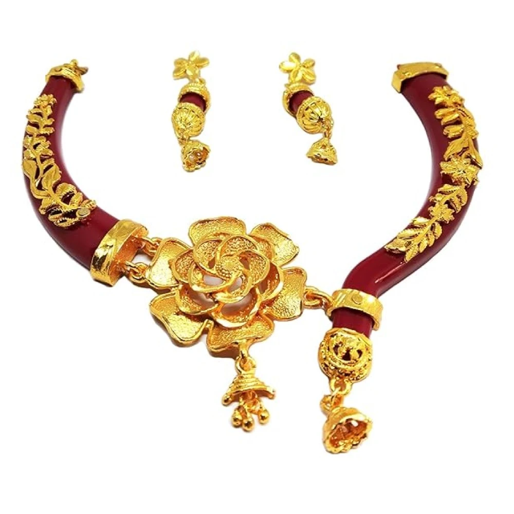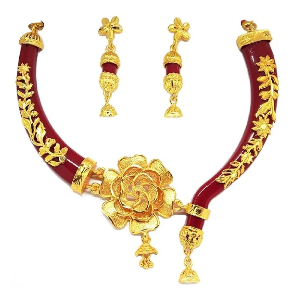 Make a statement and elevate your style with our Gold Plated Plastic Red Color Pola Necklace Set, a beautiful addition to your jewelry collection that captures the essence of tradition and grace.