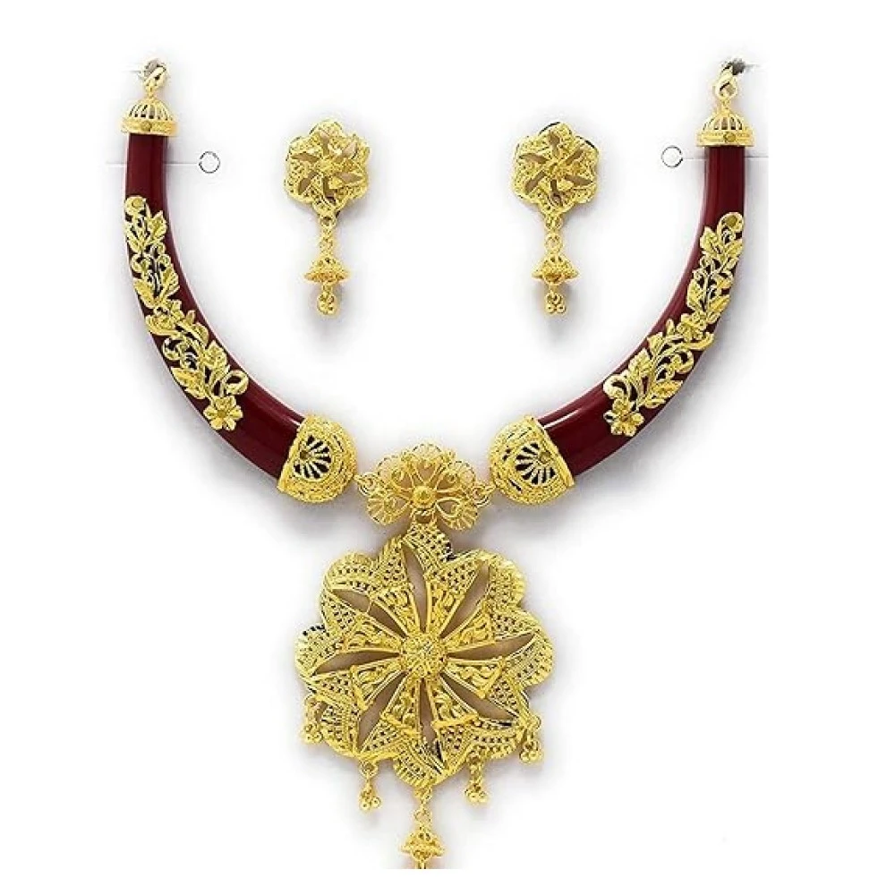 Make a statement and elevate your style with our Gold Plated Plastic Red Color Pola Necklace Set, a beautiful addition to your jewelry collection that captures the essence of tradition and grace.