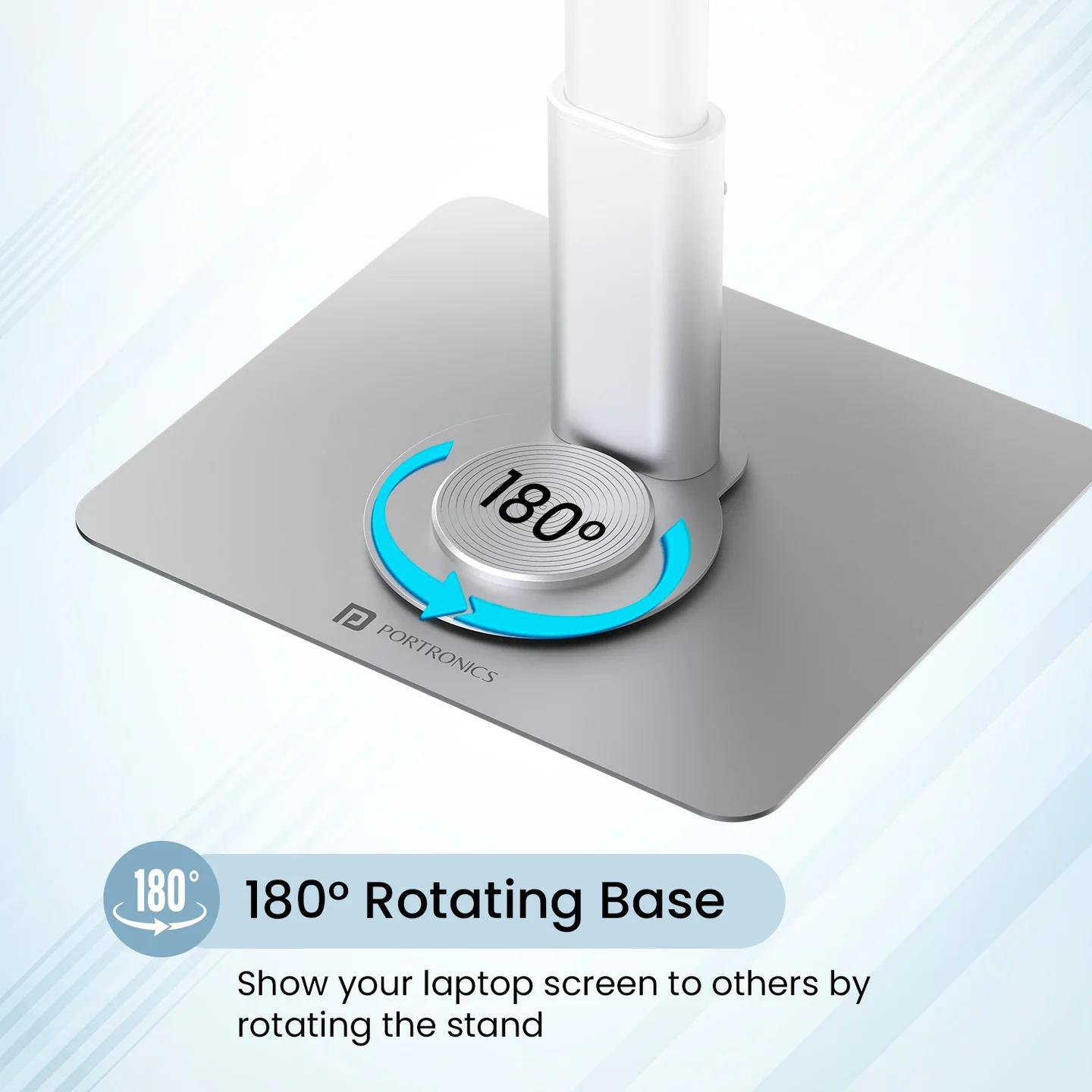 Portronics Twister Metal Laptop Stand will enhance your laptop experience with its adjustable height design, improving airflow and posture, ideal for laptops up to 15.6 inches. Perfect for home or office use, this stand provides stability, comfort, and a sleek, space-saving solution for better productivity. Key Features ✅ Portronics Twister: Metal Laptop Stand makes for an excellent, compact, and carry-along productivity tool — whether you're working at home, in the office, or traveling for a conference. Its versatility comes from multiple adjustment angles, helping you maintain the right height and viewing position every time. ✅ 360° Rotating Base Swivel your laptop to any angle and share the display with others comfortably using the flexible 180° rotatable base of this portable laptop stand. ✅ Ventilated Board The ventilated design ensures proper airflow, preventing your laptop from overheating. This helps maintain performance and extends the device’s lifespan. ✅ Ergonomic Design Boost productivity and comfort by lifting your laptop to eye level. Promotes better posture and helps avoid hunching, neck, back, and shoulder strain. ✅ Anti-Slip Silicone Pads Equipped with anti-slip silicone pads on both the hooks and surface, ensuring your laptop remains stable, scratch-free, and securely in place. ✅ Up to 15.6'' (39.624 cm) Laptop Support Compatible with laptops, MacBooks, and tablets up to 15.6 inches, making it a versatile choice for various devices. ✅ Stable and Durable Constructed from strong carbon steel alloy, this stand supports up to 10 kg of weight — offering excellent stability and long-term durability.