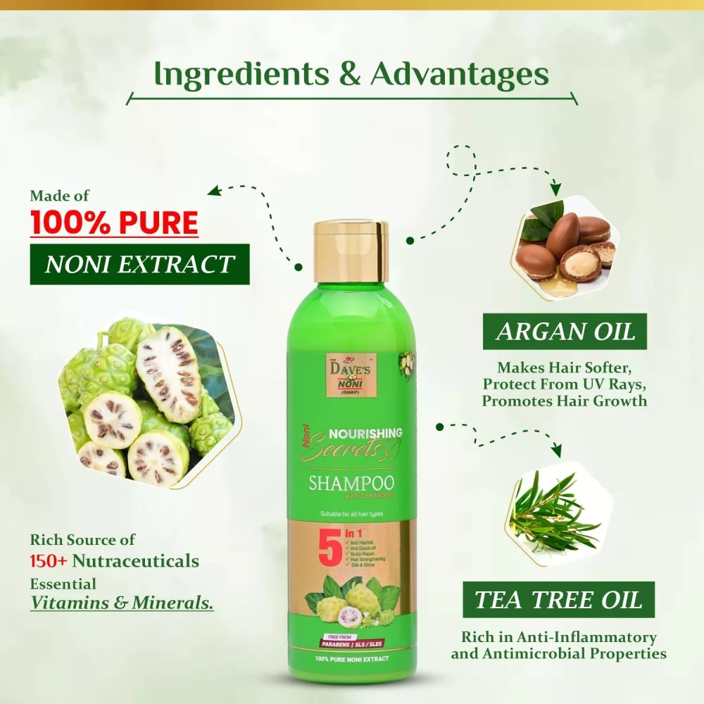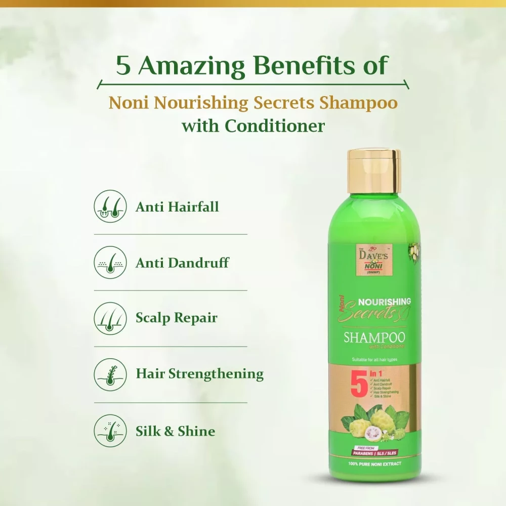NONI Nourishing Secrets Shampoo contains all the rich essential compounds that can strengthen your hair, repair your scalp, stop dandruff and reduce hair fall Cleanse, hydrate, and enrich your hair with this Nourishing secrets shampoo, rich shampoo that will not weigh your hair down. Keep your hair cleaner and longer. Adds incredible shine.