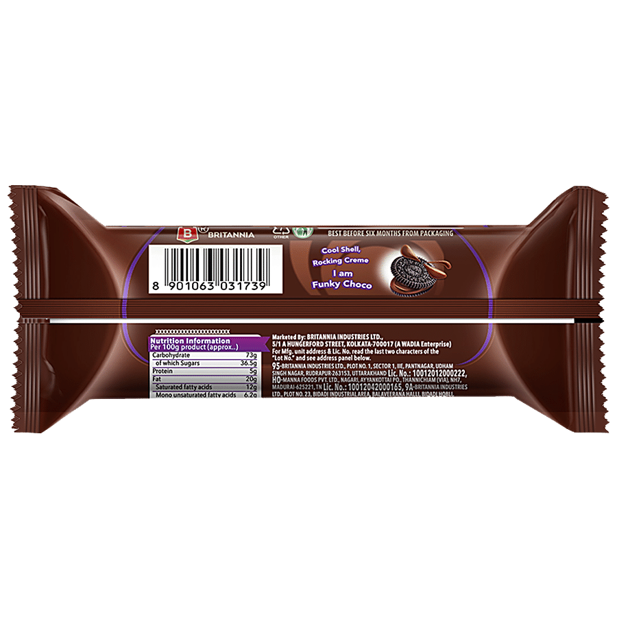Britannia Treat Chocolate Cream Biscuits are packed with delicious cream to make them a treat for kids. The smooth cream filled inside is so soft and lickable, making these delicious biscuits so irresistibly tasty. Britannia biscuits and cookies for long has been a part of every home, sharing those moments of joy. Believing in delivering fresh and healthy products, Britannia India manufactures some of India's favourite brands like 50-50, Tiger, NutriChoice, Bourbon, Good Day, Milk Bikis and Little Hearts.
