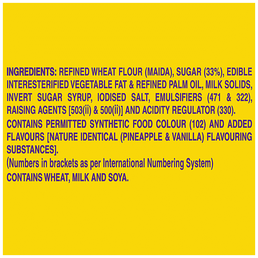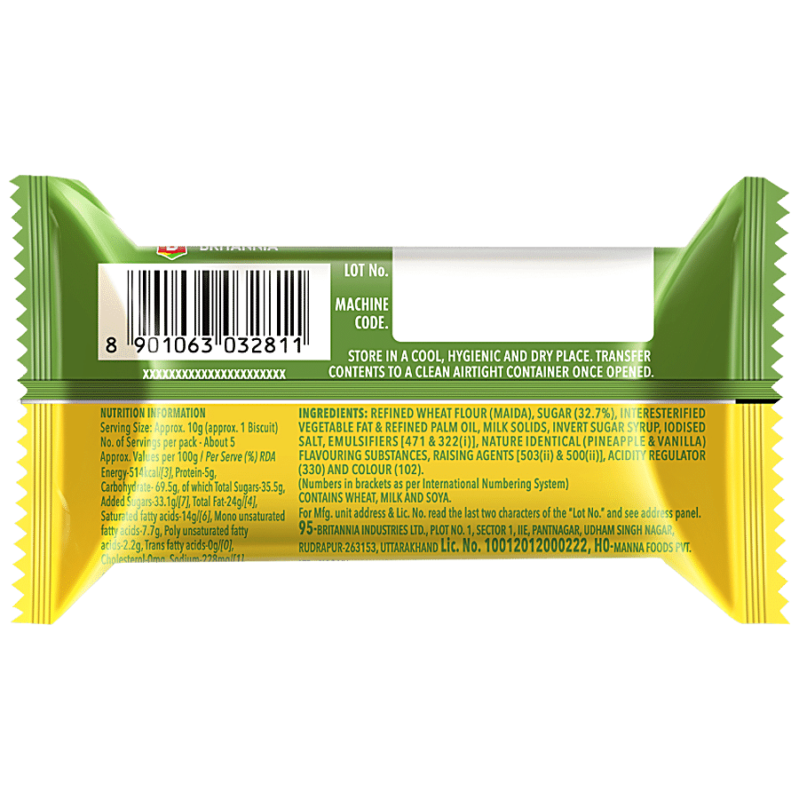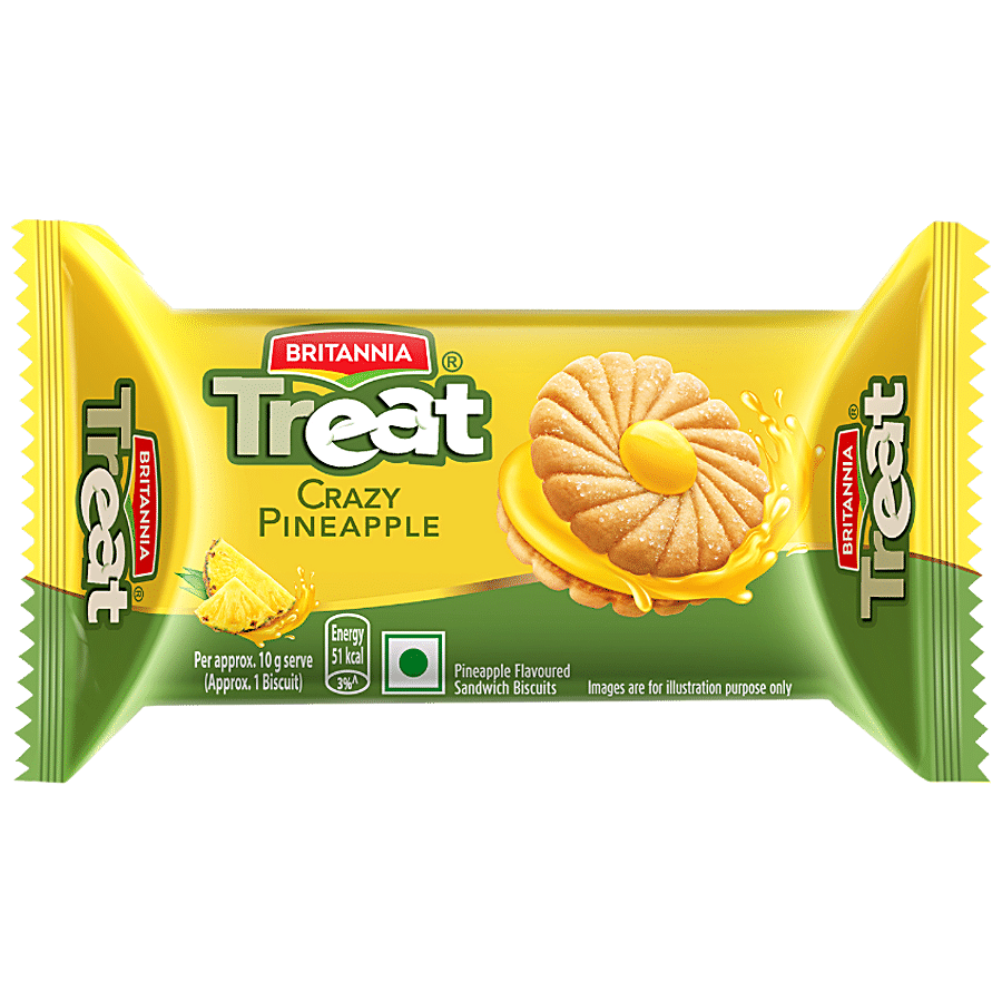 Britannia Treat Pineapple Cream Biscuits are packed with delicious cream to make them a treat for kids. The smooth cream filled inside is so soft and lickable, which makes these delicious biscuits so irresistibly tasty. Pineapple flavour gives these biscuits a refreshing taste. Britannia biscuits and cookies for long have been a part of every home, sharing those moments of joy. Believing in delivering fresh and healthy products, Britannia India manufactures some of India's favourite brands like 50-50, Tiger, NutriChoice, Bourbon, Good Day, Milk Bikis and Little Hearts.