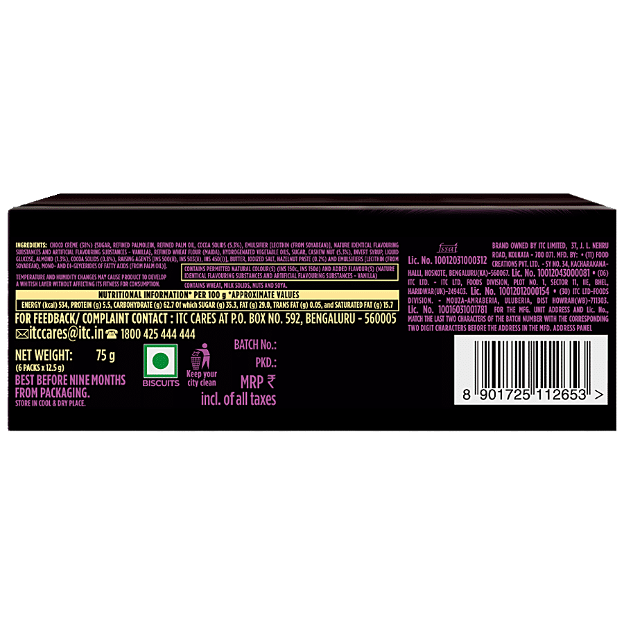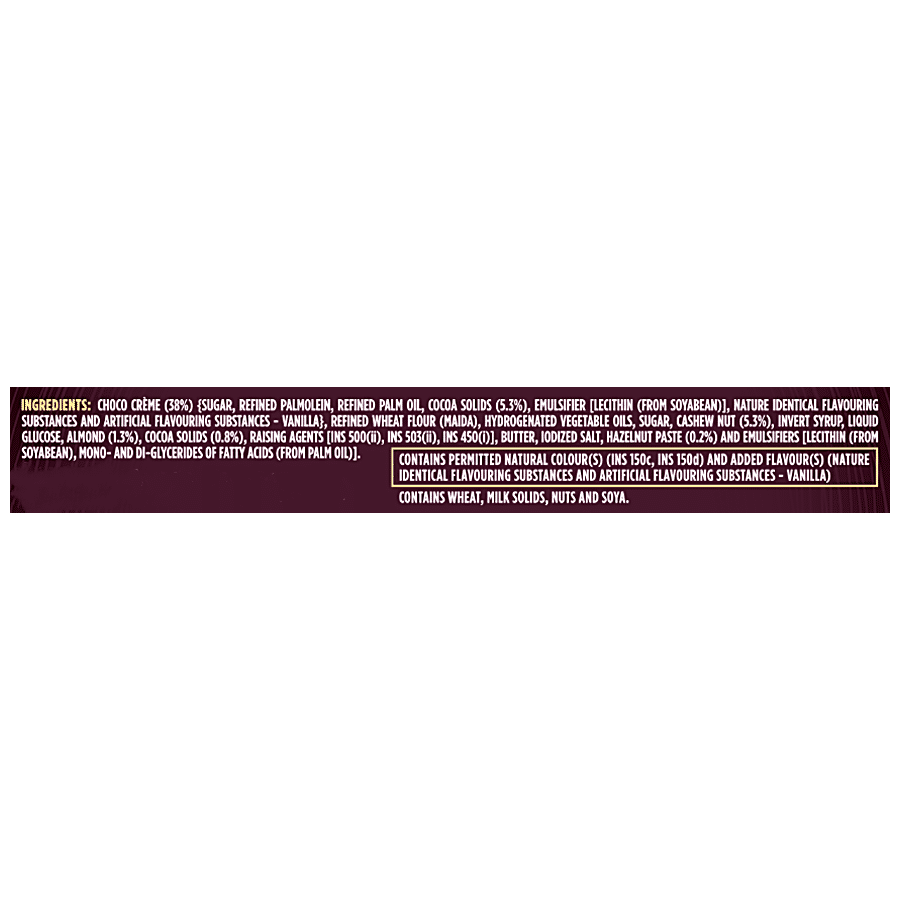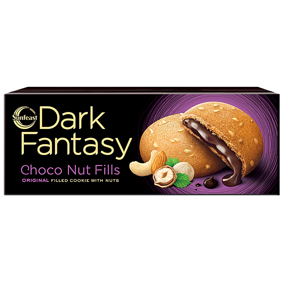 Discover true indulgence like never before with Sunfeast Dark Fantasy Choco Nut Fills. With every bite of this delectable cookie, you'll find yourself deeper into an indulgent fantasy. So, take a bite and you can turn on the Din Khatam, Fantasy Shuru mode. Bite into the perfectly baked crunchy cookie shell with almonds and cashews to discover a luxurious hazelnut and choco cr�me filling. Treat yourself to a myriad of flavours and textures. Feel the crunchiness from the crust that is laden with nuts followed by the richness of the smooth hazelnut and choco cr�me. Crafted and perfected by our ITC Master Chefs, Dark Fantasy Choco Nut Fills is the answer to your cravings - for a sinful dessert experience, a sweet snack on the go, or a midnight bite. Irrespective of the time, place and mood, this tempting cookie will always lift your spirits. A rich, chocolaty, and nutty snack, Sunfeast Dark Fantasy Choco Nut Fills can also be shared with your loved ones. Although, we bet that you won�t like sharing it with anyone. Experience the perfect symphony of flavours as the crunchiness of nuts and indulgence of Dark Fantasy come together for a multi-texture and multi-flavour experience.