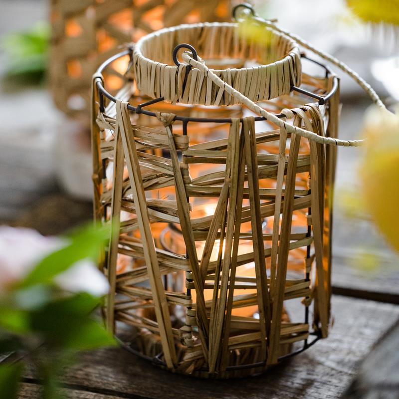 Juhan natural color triangular straw handle wind lantern candle holder lantern floor hanging ornaments hand-woven pastoral style -White round small candle