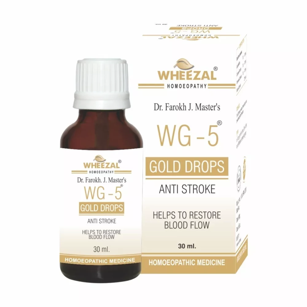 Wheezal WG5 Anti Stroke Gold Drop can improve blood circulation and manage circulatory debility. It may also be useful against increased intracranial tension and brain oedema in patients suffering from brain stroke and other brain-related diseases. The drop’s homoeopathic ingredients might also help dissolve blood clots induced by stroke or other related diseases.