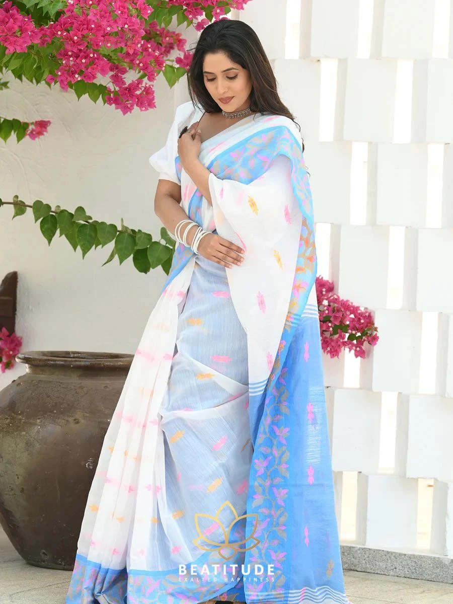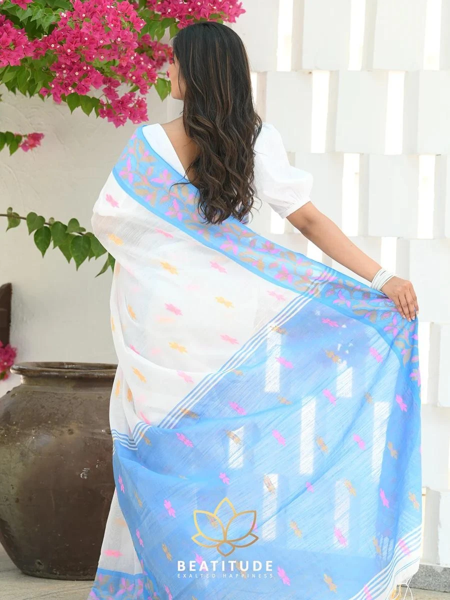 Cotton Floral White and Blue Combination silk saree with running blouse piece