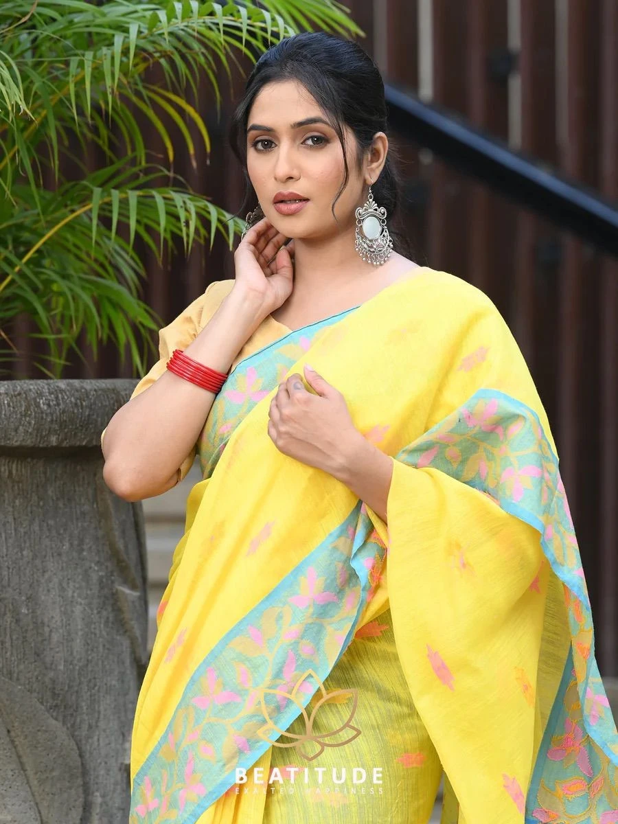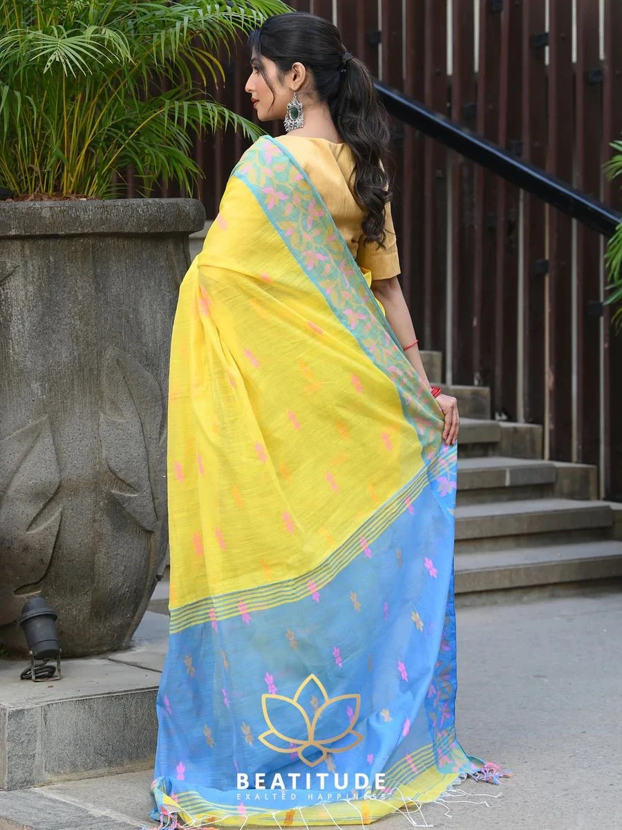 Crafted from premium quality cotton silk fabric, this saree offers a luxurious feel and a smooth, comfortable drape that enhances your natural beauty. The vibrant combination of yellow and blue hues creates a captivating contrast, adding a touch of sophistication to your ensemble.