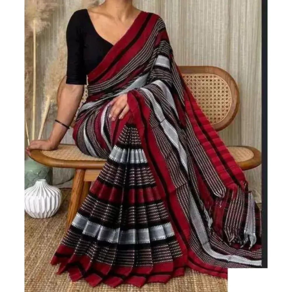 This saree boasts a stylish Striped pattern, adding a touch of sophistication to the traditional Cotton fabric. Crafted from premium-quality Cotton, the fabric drapes gracefully, providing a luxurious feel against the skin while enhancing your natural beauty.