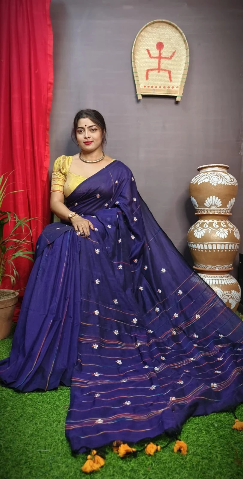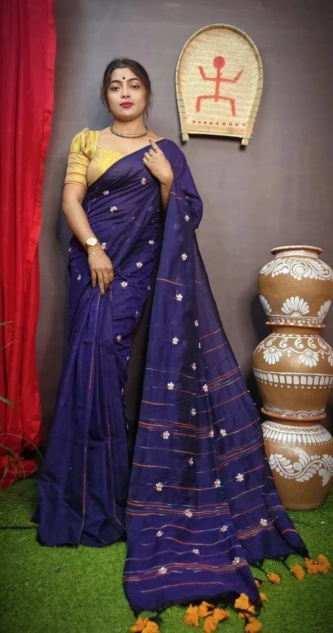 Crafted from premium fabric, this saree boasts a luxurious texture that drapes beautifully, ensuring both comfort and style. The intricate khesh weaving technique adds a touch of sophistication, while the delicate embroidery enhances its allure.