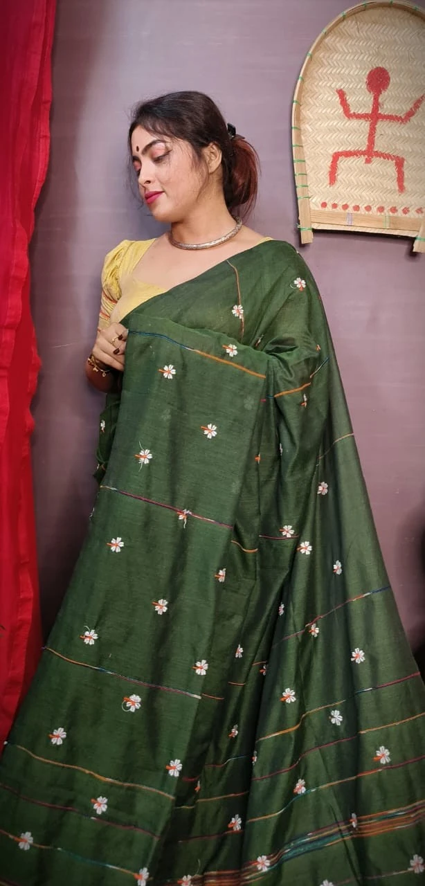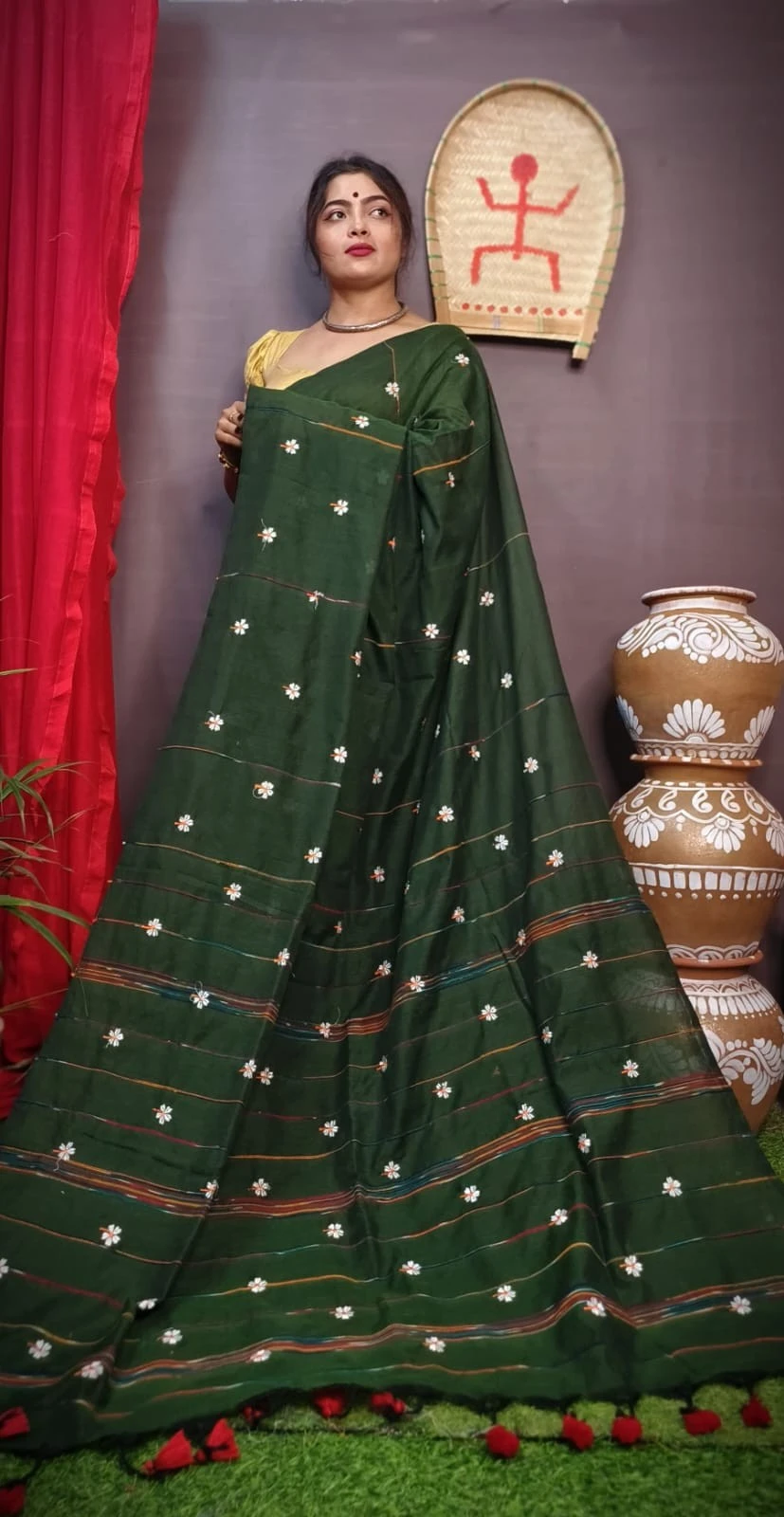 Introducing our exquisite Khesh Cotton Embroidery Green Saree, a masterpiece of elegance and sophistication.