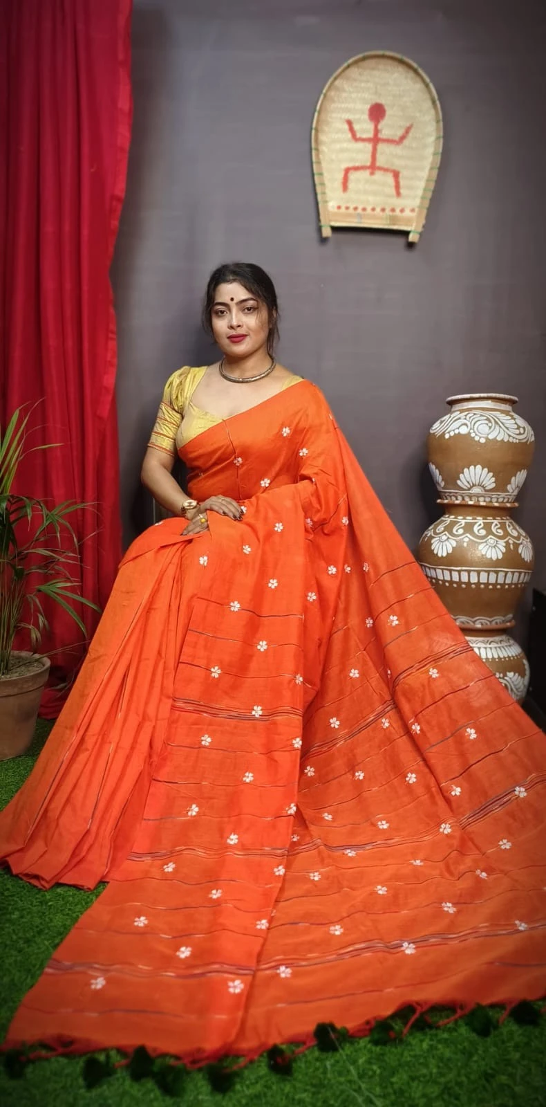 Introducing our exquisite Khesh Embroidery Orange Saree, a perfect blend of traditional craftsmanship and modern elegance.