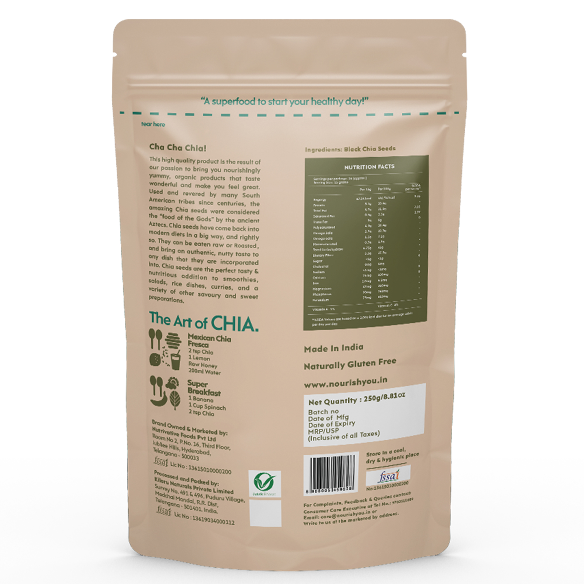 nourish you Black Chia Seeds are nutrient-dense superfoods rich in Omega-3, fiber, protein, and antioxidants. These organic, gluten-free seeds support heart health, digestion, and energy levels. Perfect for smoothies, salads, or as an egg substitute in recipes.