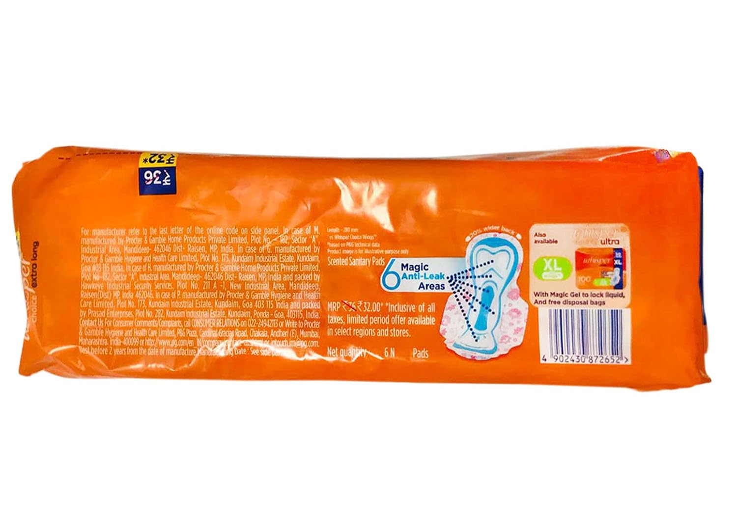 Whisper Choice Ultra XL provides up to 100 stain protection and is 50mm longer vs regular pads . It comes with individual disposal wrappers. It has a blue core with liquid lock Magic gel that locks wetness in, along with an All-around leakguard that prevents leakage from any side. The pads come with wings that fit snugly around the panty to keep the pads in place. It also has a Fresh flower scent for freshness even during periods.