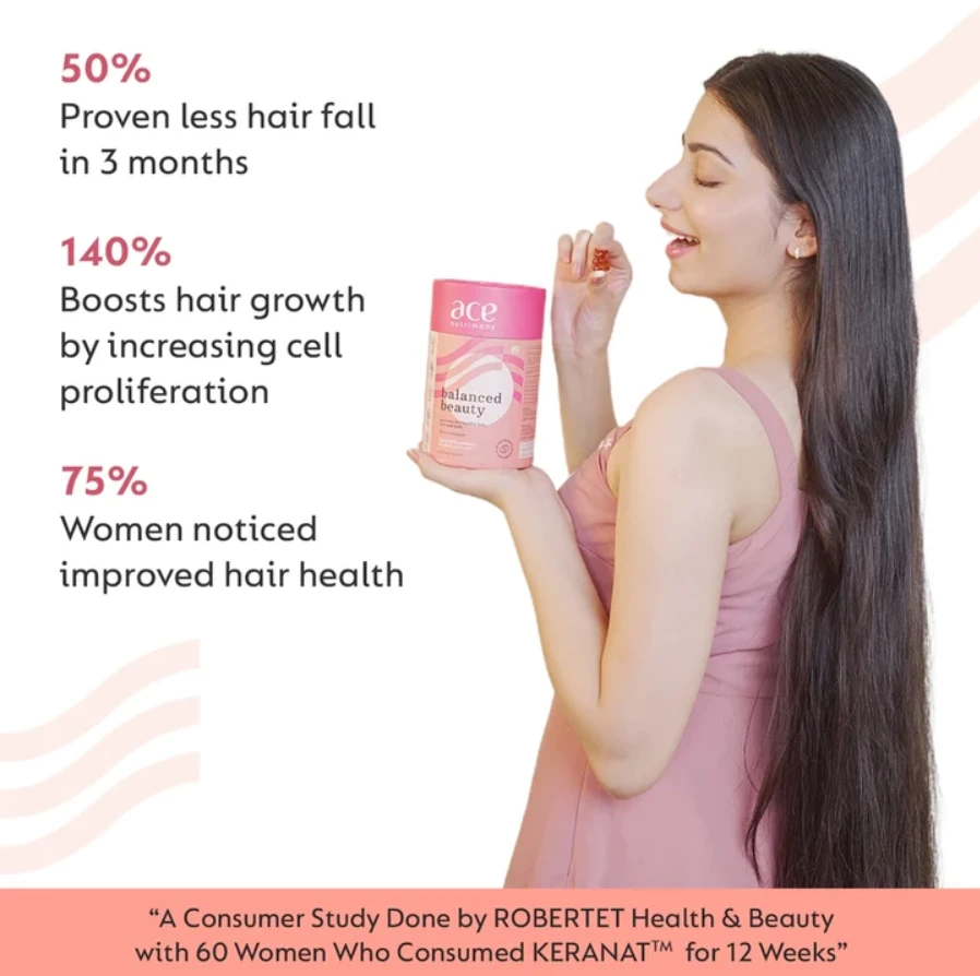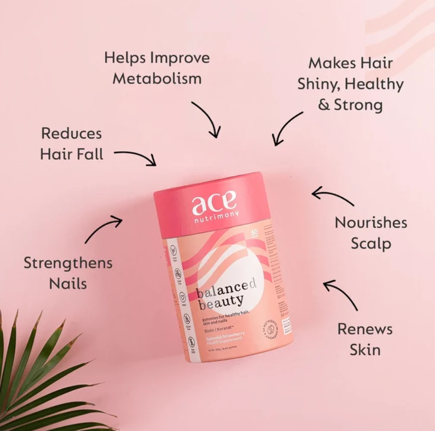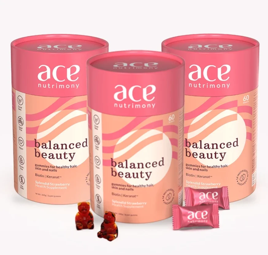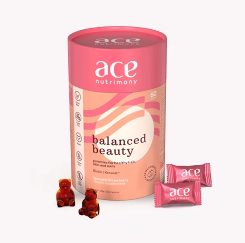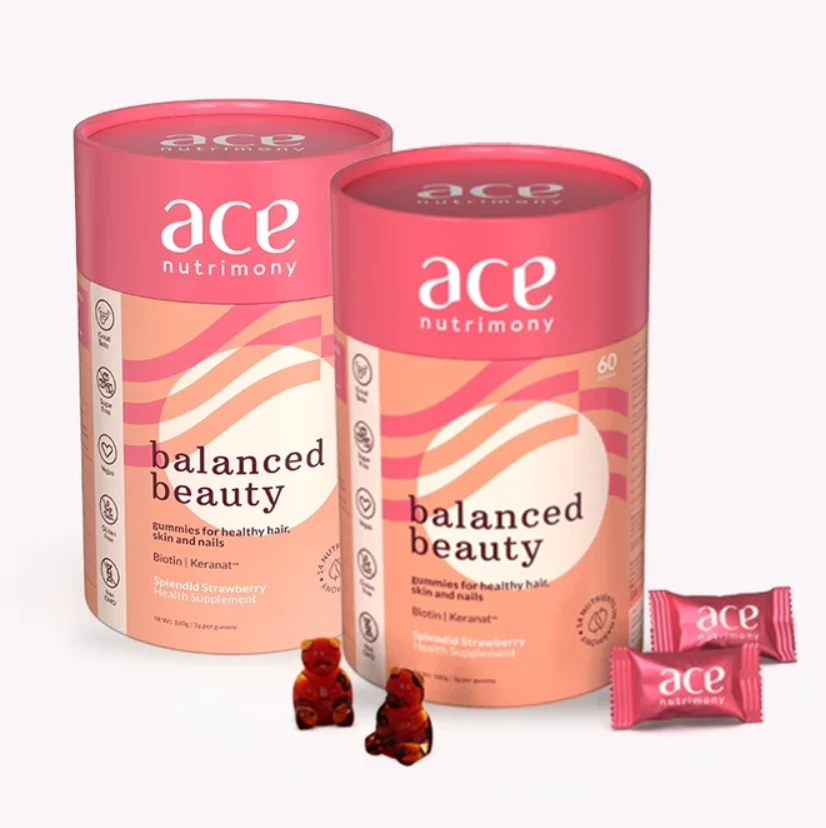 Perfectly Balanced Nutrient Fusion - Our Ace Nutrimony Gummies boast a harmonious blend of nature's best choices, featuring Biotin, Keranat, Folic Acid, Zinc, Vitamins A to E, and Selenium. Tailored to be the ultimate supplement for your hair, skin, and nails.