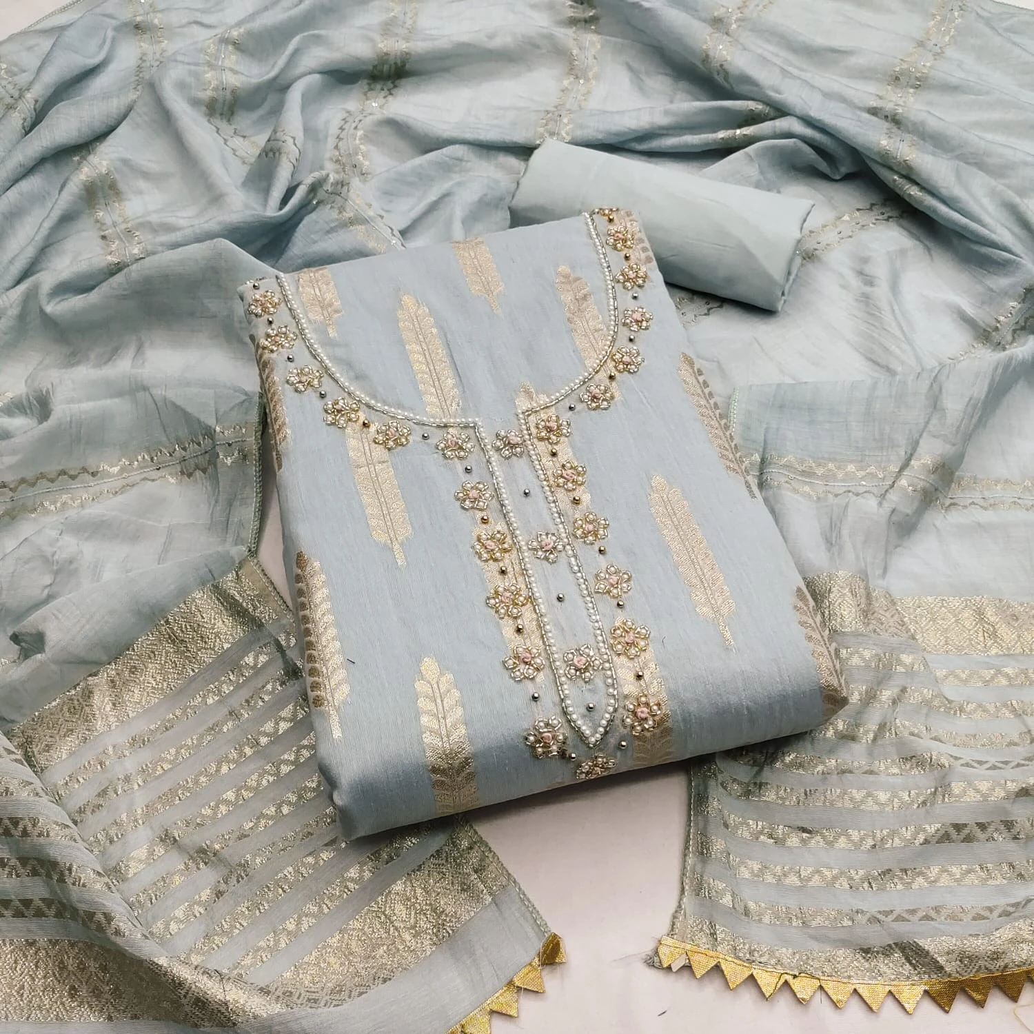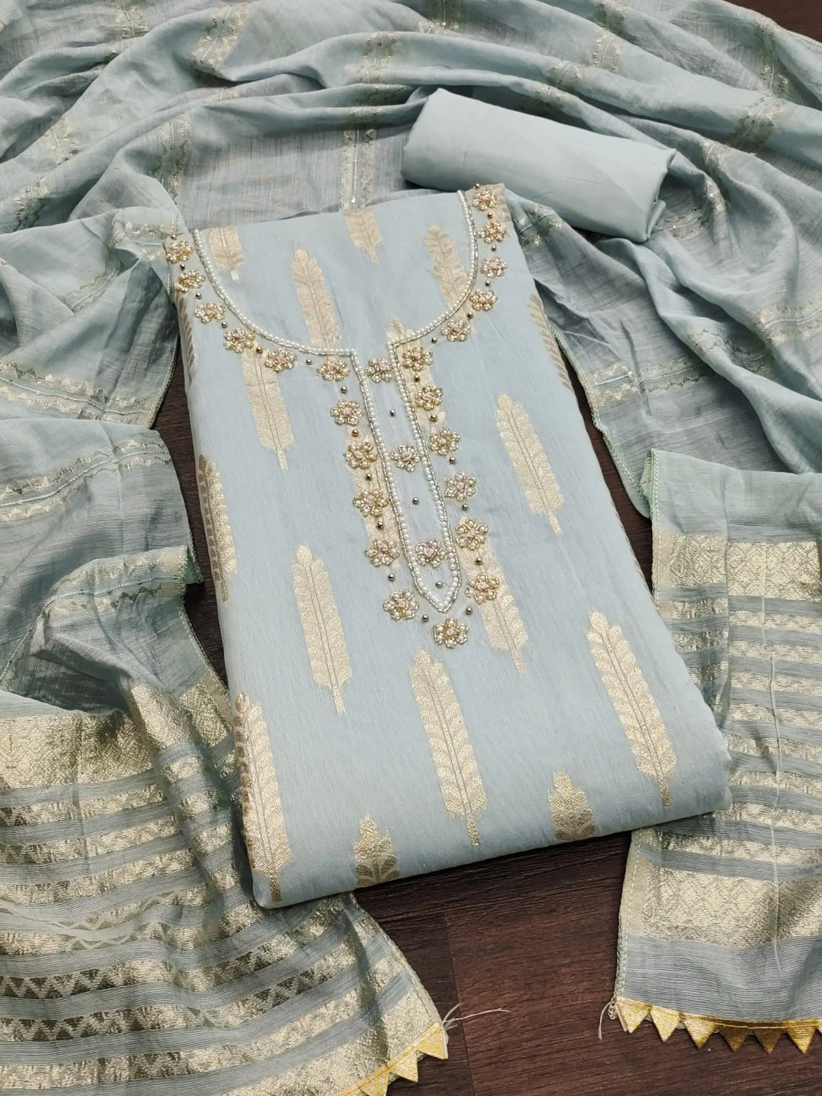 TOP-BANARASI SILK JACQUARD WITH HANDWORK(2.1 MTRS)INNER AND BOTTOM-SANTOON(3.5 MTRS), DUPATTA:-SILK JACQUARD(2.1 MTRS)