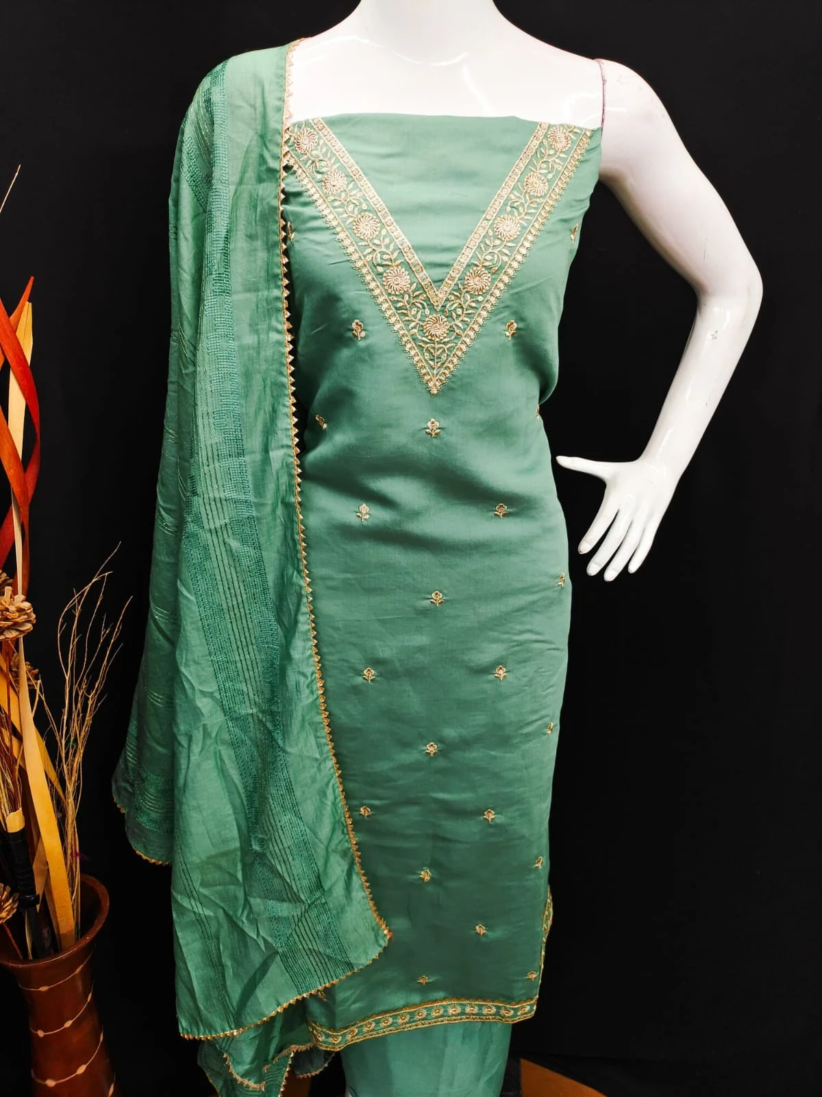 Dupatta: Complete your ethnic look with the included Chanderi Dupatta featuring intricate cross-head work. Measuring 2.20 meters, the dupatta adds a touch of sophistication and allure to your attire, elevating its overall appeal with its detailed craftsmanship and luxurious feel.