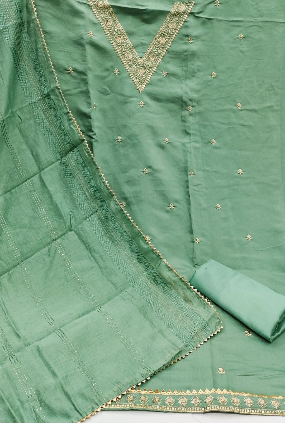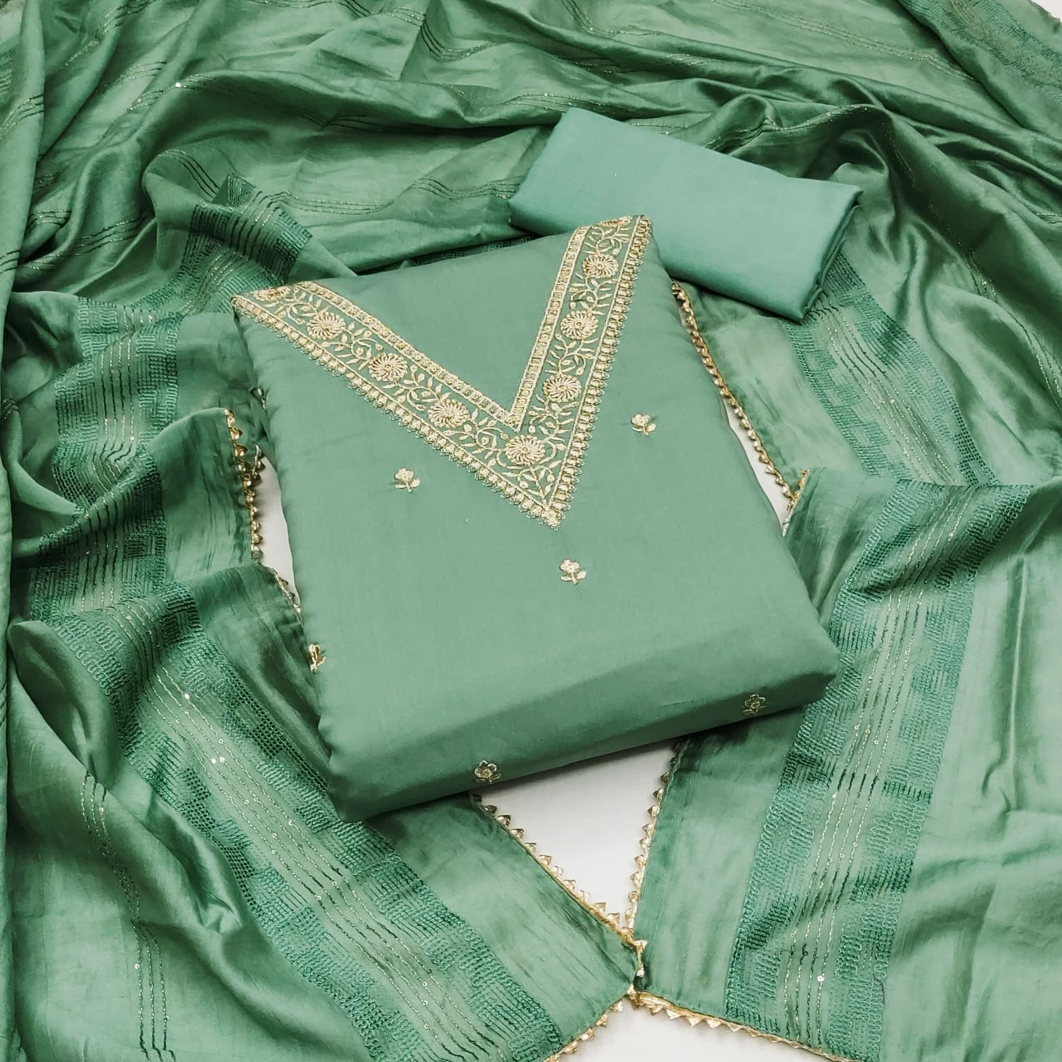 Introducing our exquisite Chanderi Silk Dress Material in a refreshing light green shade, designed to elevate your ethnic wardrobe with its timeless elegance and intricate detailing.