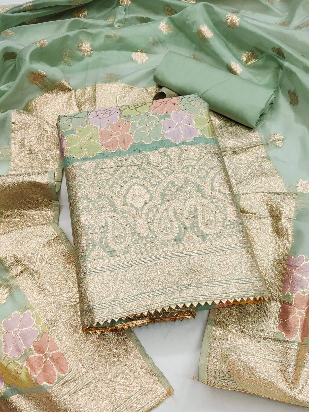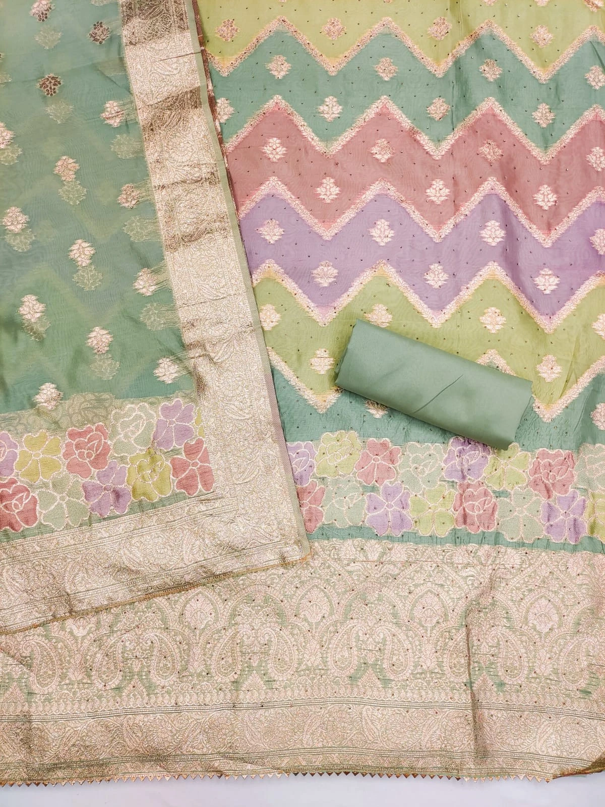 Classic ORGANZA Green Dress Material WITH DIAMOND WORK and BANARASI SILK DUPATTA