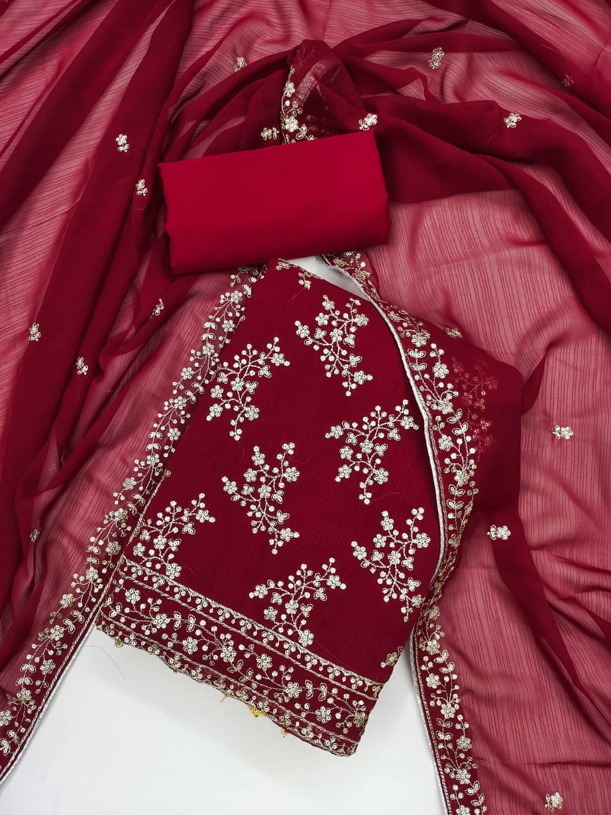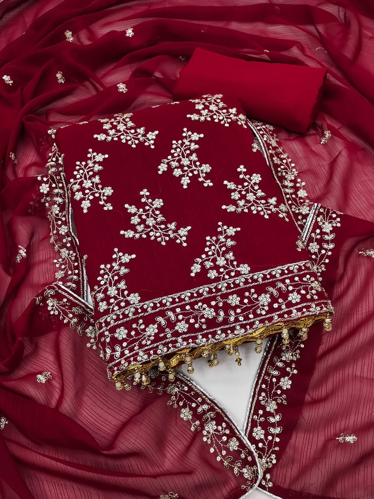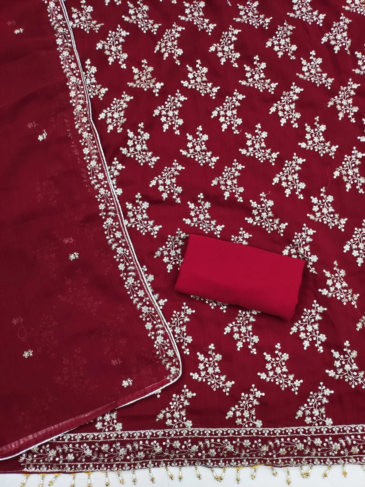 GEORGETTE Maroon Dress Material WITH ZARI WORK AND LATKAN LACE WORK