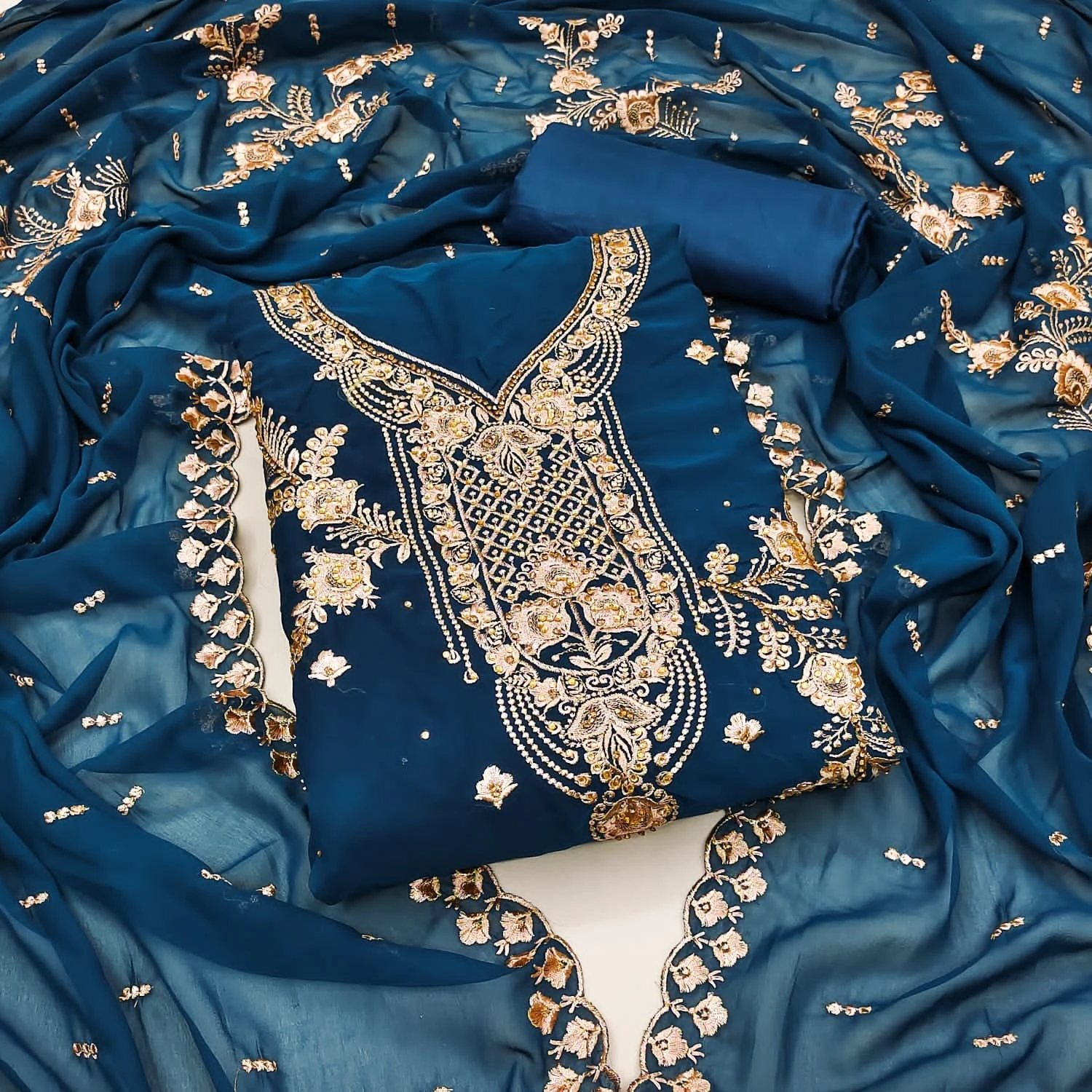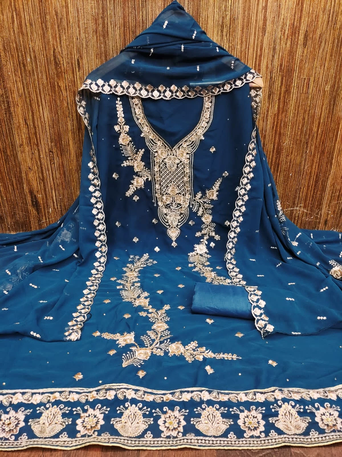Elevate your ethnic attire with our Georggette Blue Salwar Suit Material and make a statement with its exquisite embroidery work and timeless design.
