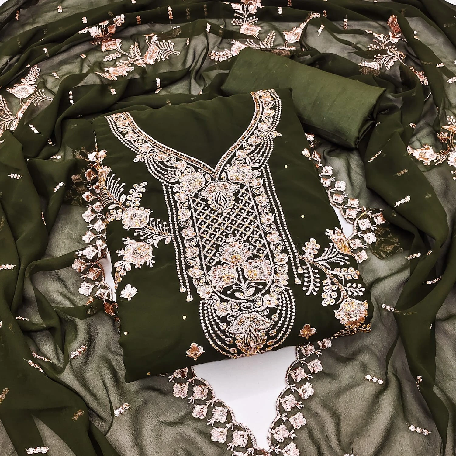 Elevate your ethnic look with our Georggette Mehendi Salwar Suit Material, and let its exquisite embroidery work and premium fabric elevate your style quotient.