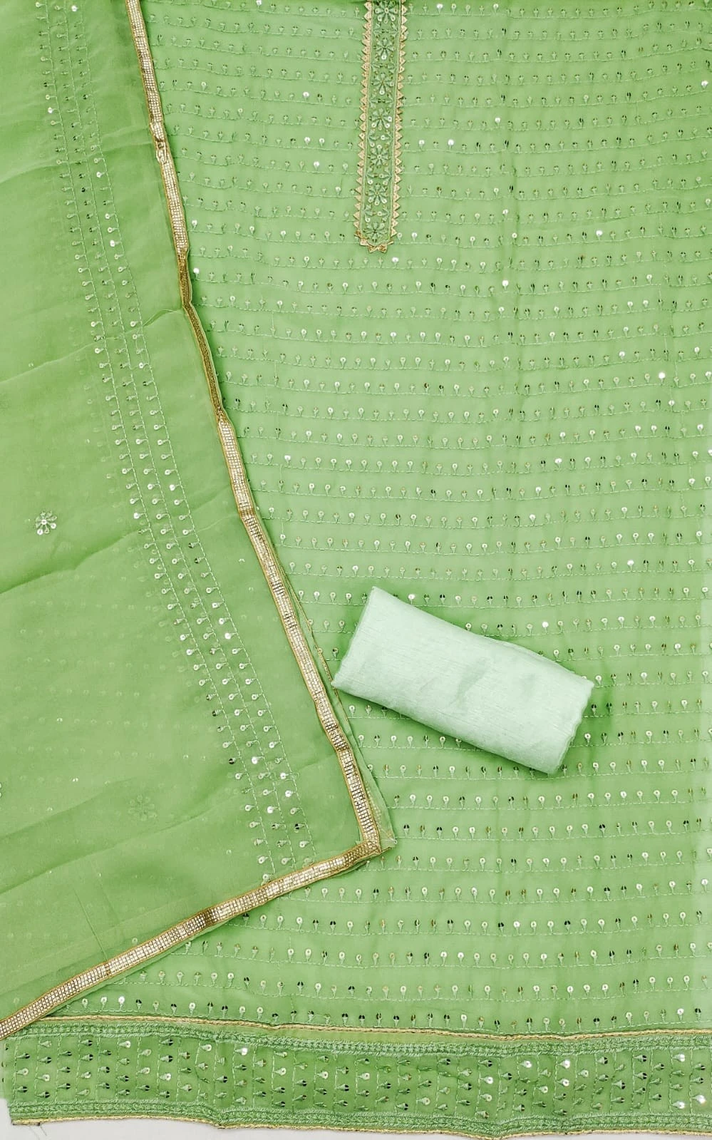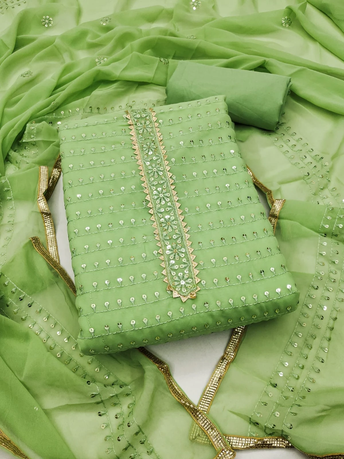 Make a style statement with our Ice Cream Baby Green Georgette Dress Material, featuring intricate embroidery and sequin work for a touch of luxury and charm.