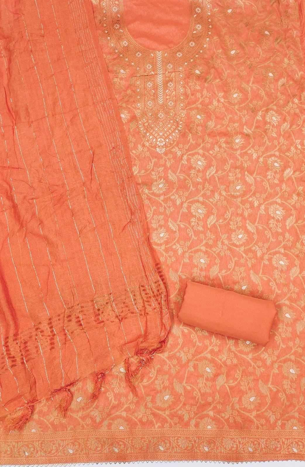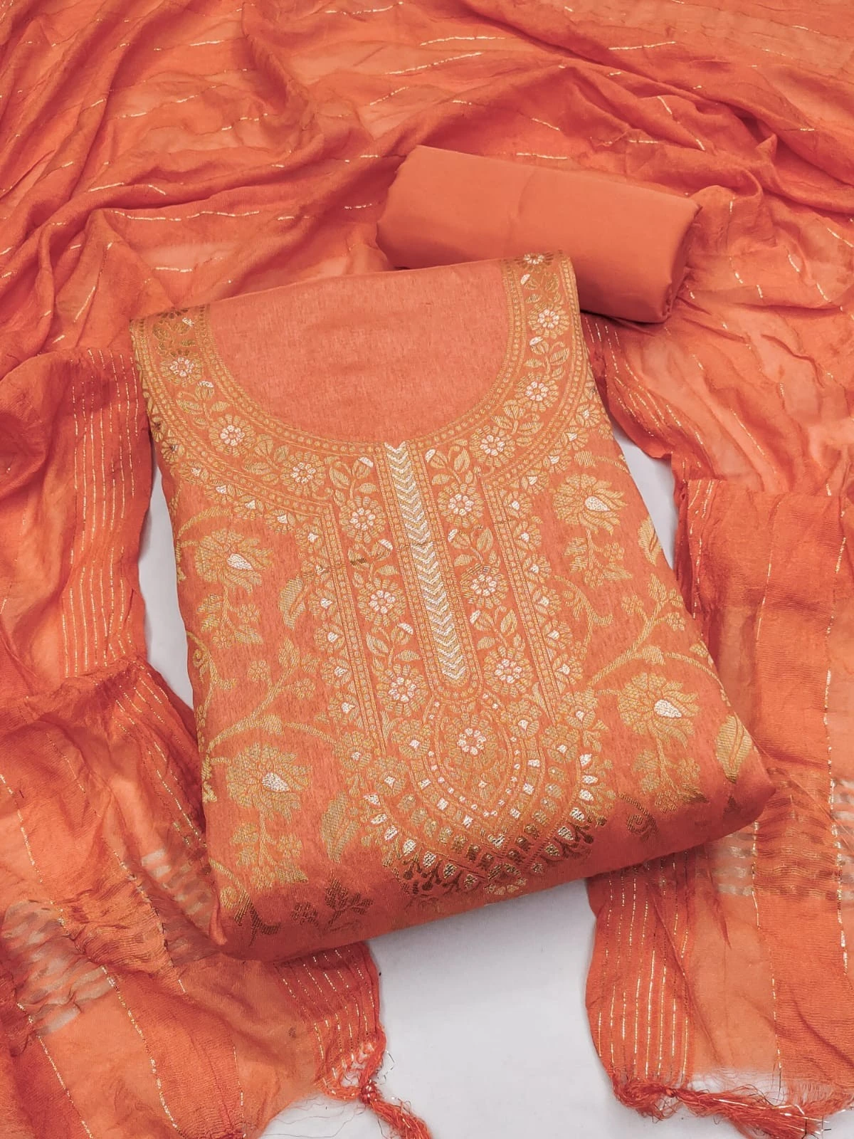 Elevate your ethnic wardrobe with our Orange Unstitched Banarasi Silk Dress Material, exquisitely crafted to add grace and allure to your ensemble. Here's why it's a must-have for your collection: