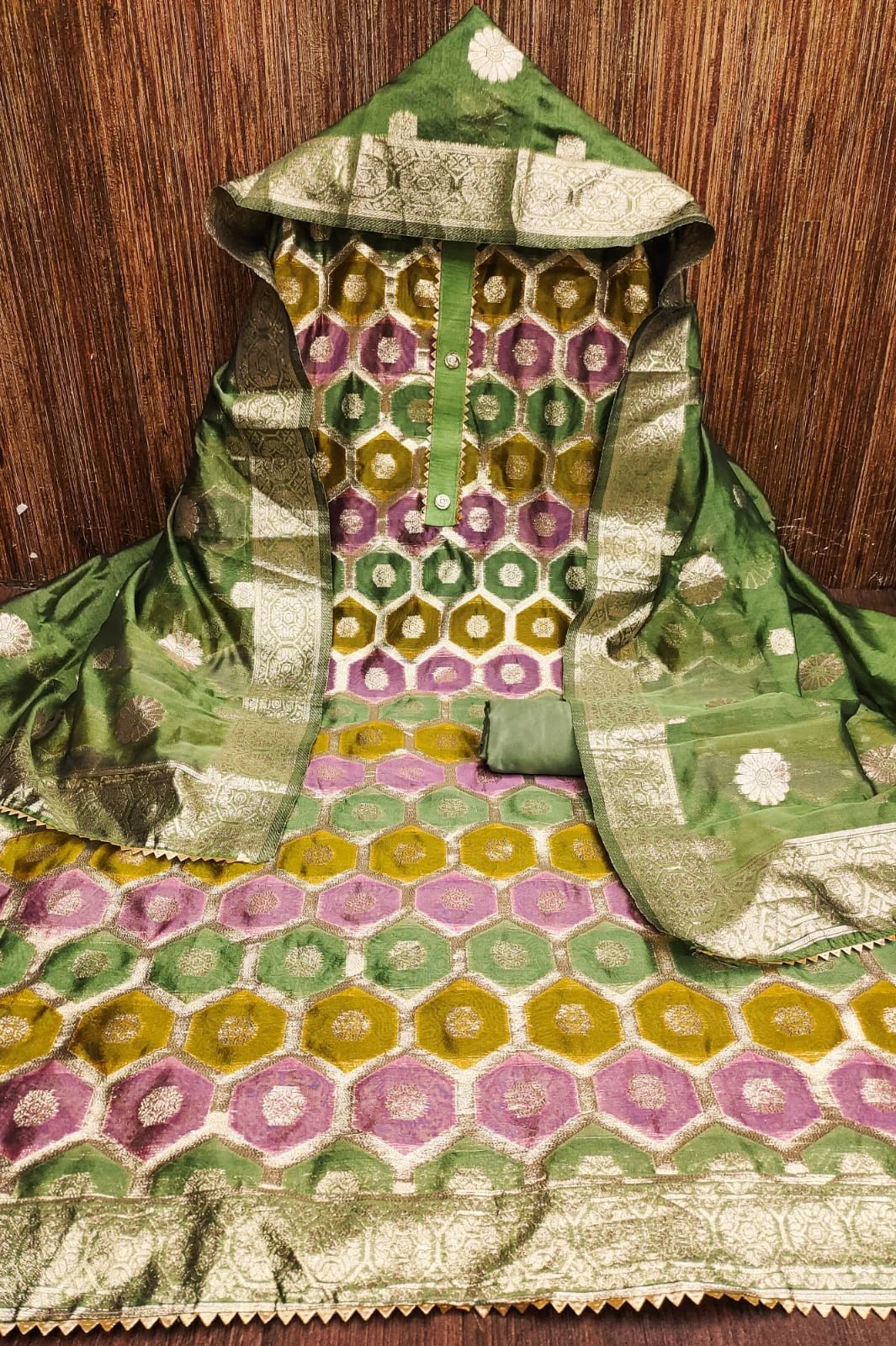 Indulge in the timeless beauty and regal charm of our Organza Banarasi Jacquard Green Dress Material, designed to make you stand out with unparalleled grace and style.