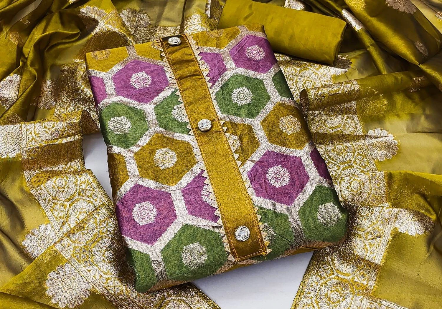 Introducing our exquisite Organza Banarasi Jacquard Yellow Dress Material, a blend of elegance and sophistication that adds a radiant touch to your ethnic wardrobe. Here's why it deserves a place in your collection: