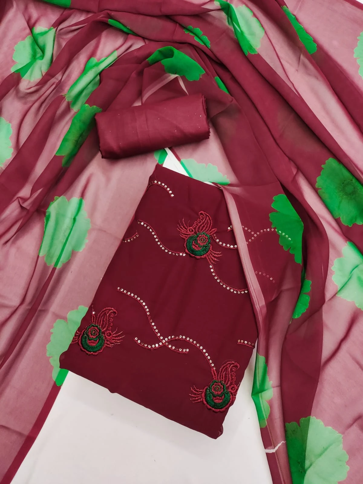 Elevate your ethnic style with our Women's Dress Material in maroon, featuring exquisite embroidery and sequence work.