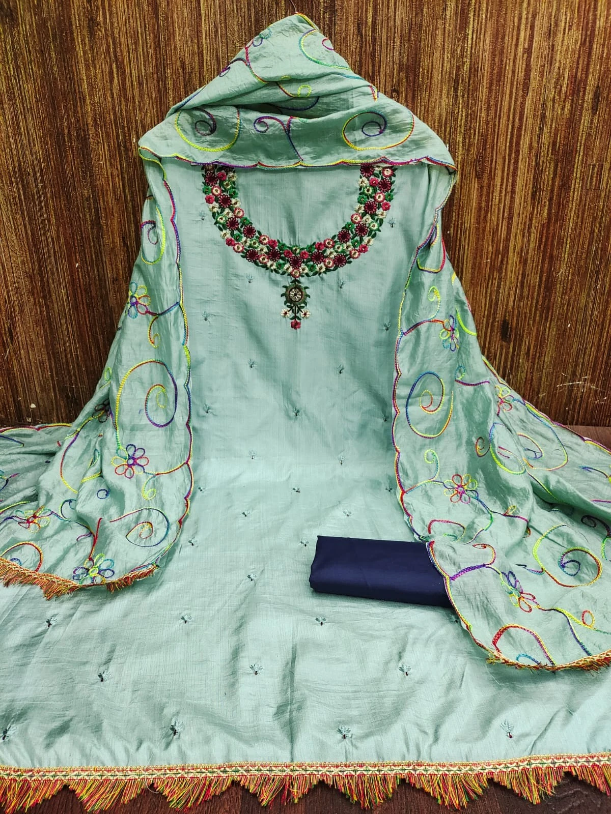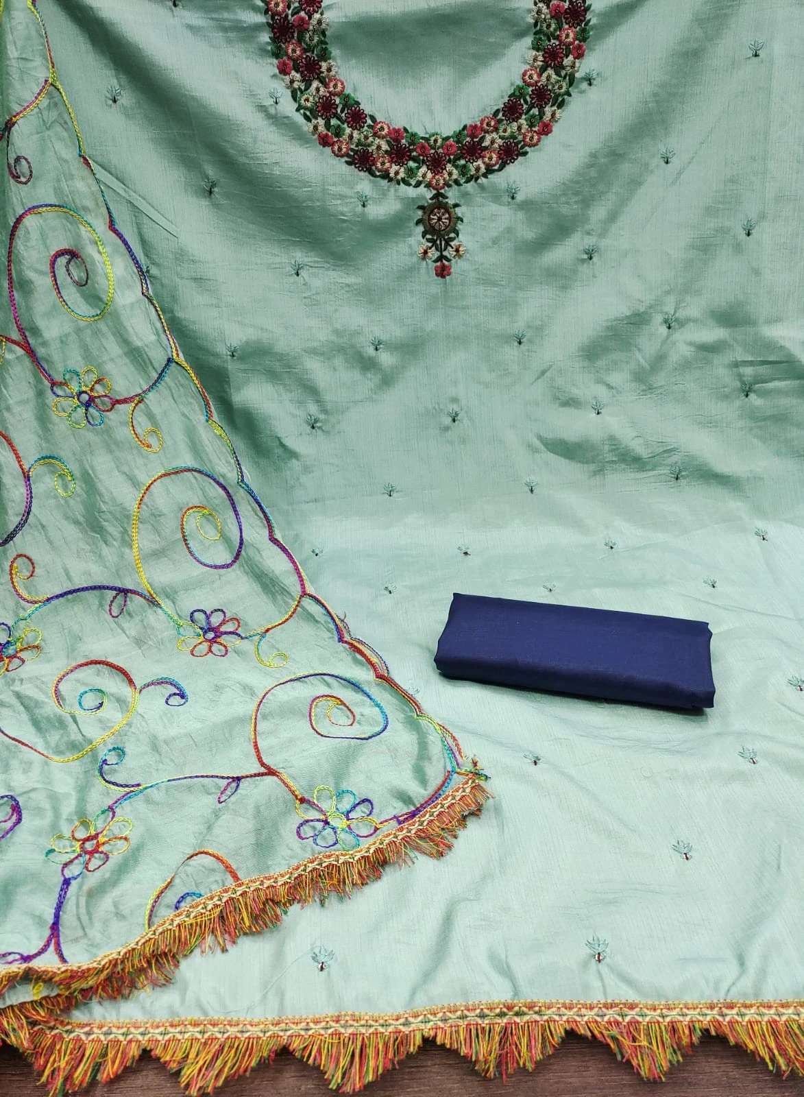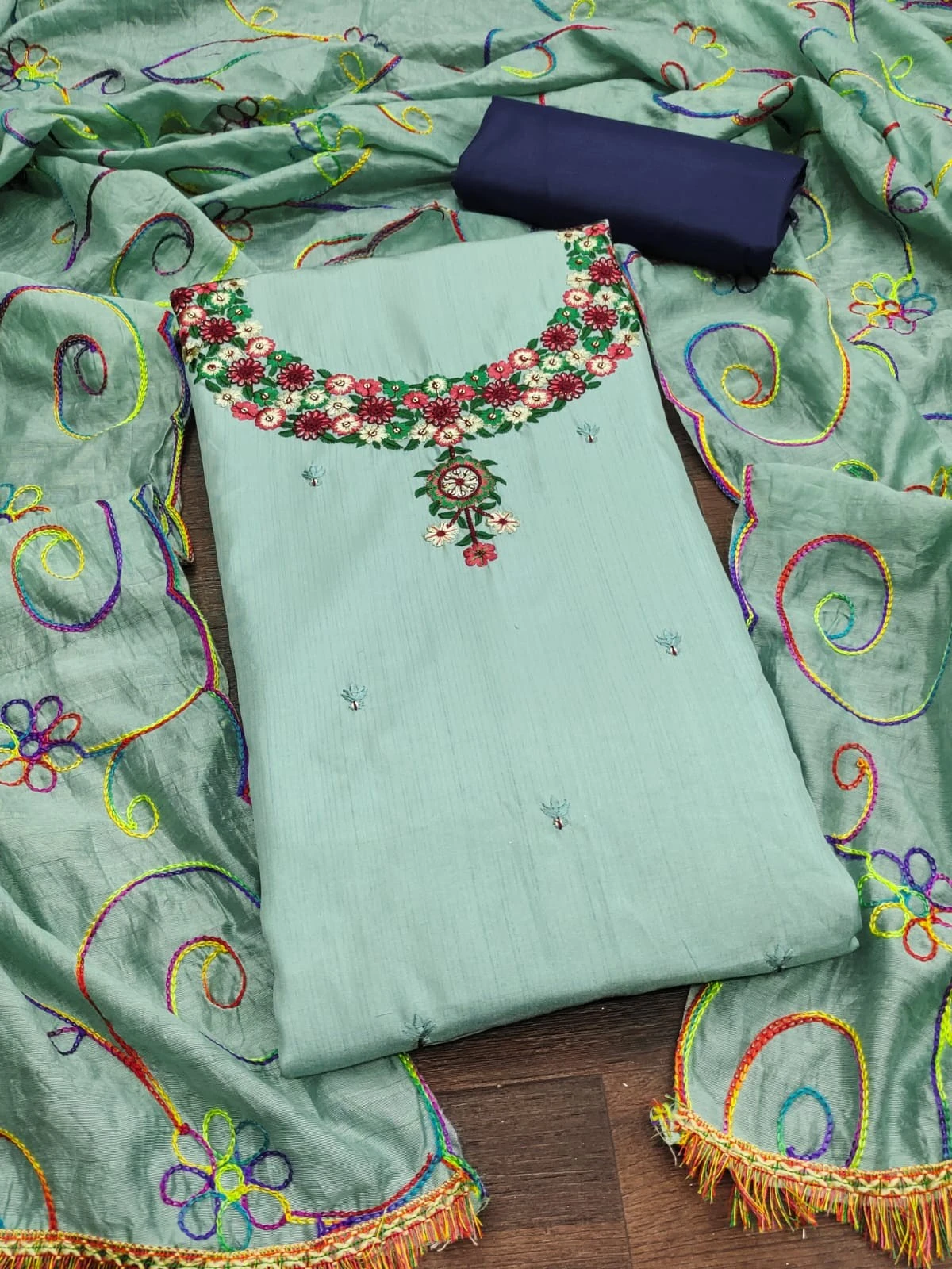 Introducing our exquisite Women Embroidery Chanderi Silks Blue Dress Material, a perfect blend of elegance and sophistication. Crafted with precision and care, this ensemble is designed to elevate your ethnic wardrobe and add a touch of timeless charm to your look.