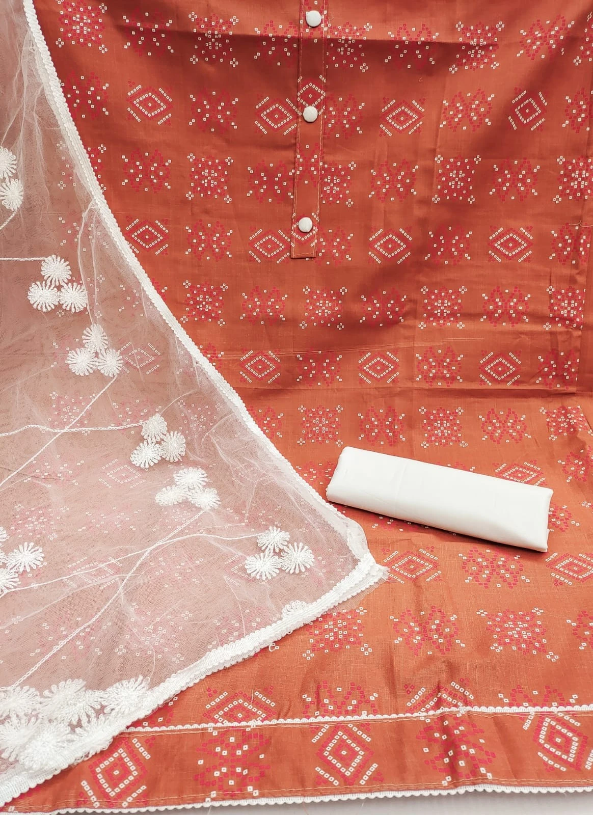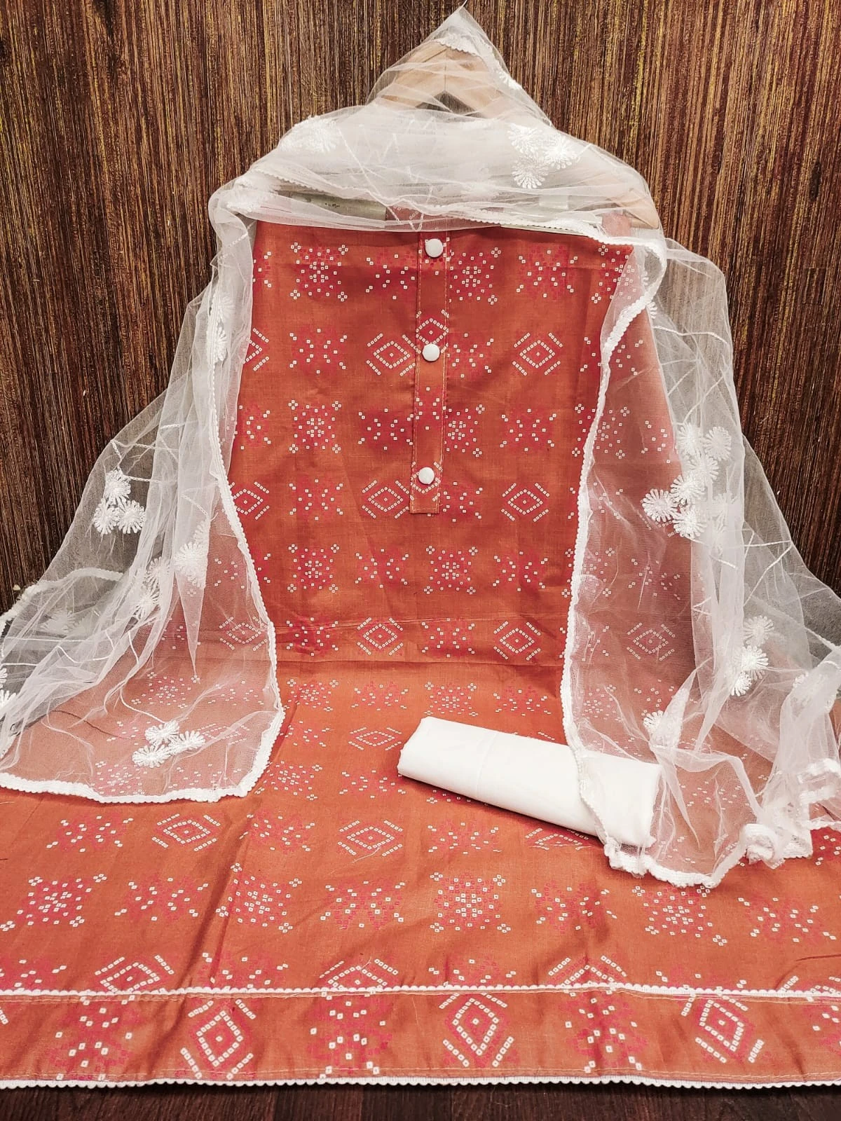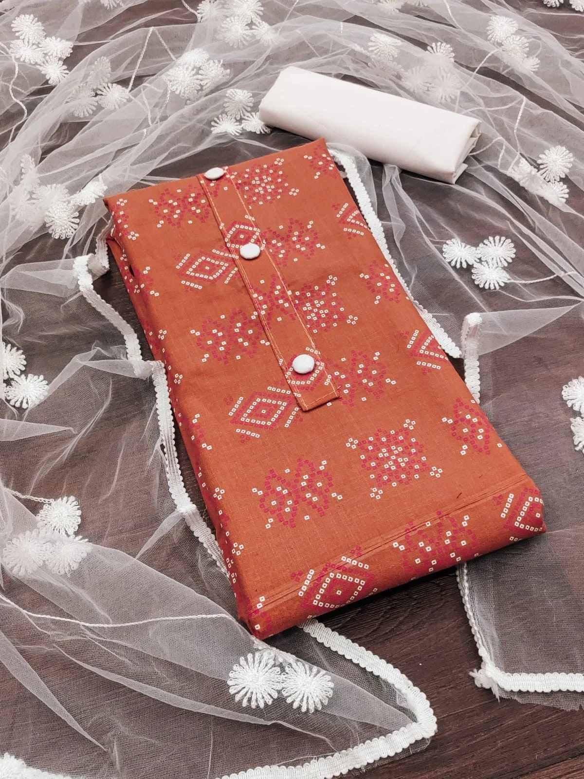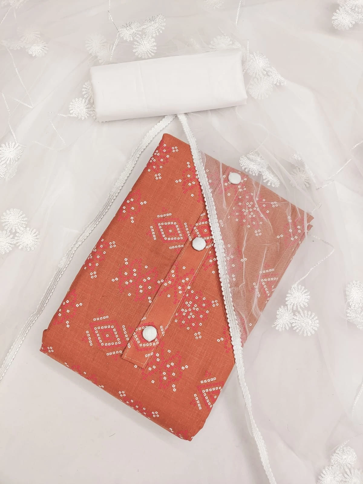 Introducing our stunning Women's Slub Cotton Dress Material in a vibrant orange shade, designed to elevate your ethnic wardrobe with its charming print and exquisite tai button detailing. Embrace the essence of traditional elegance and contemporary style with this enchanting ensemble, meticulously crafted to enhance your grace and sophistication.