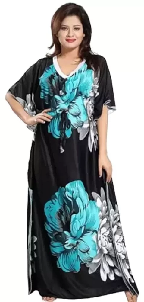 AMEEHA Floral Print Cotton Satin Blend Kaftan Half Sleeve and V Shape Neck nightwear for Women Blue Black