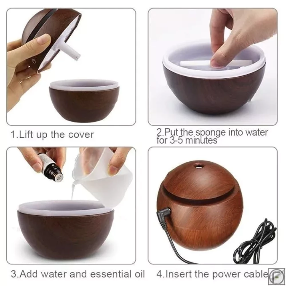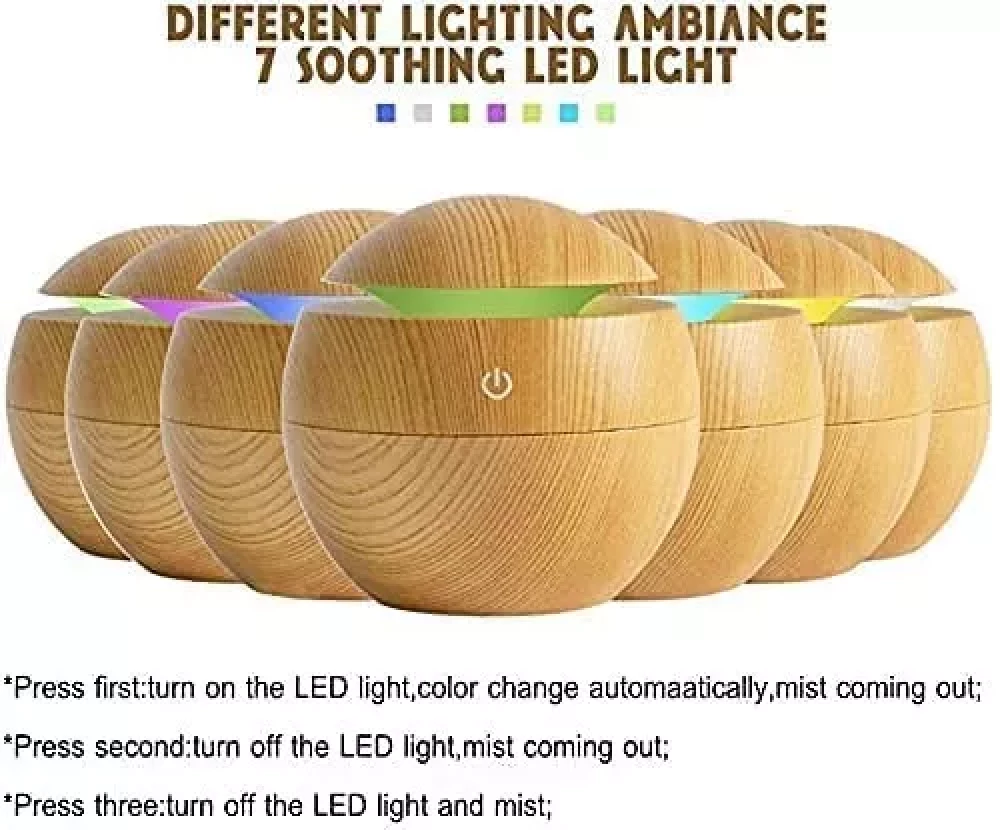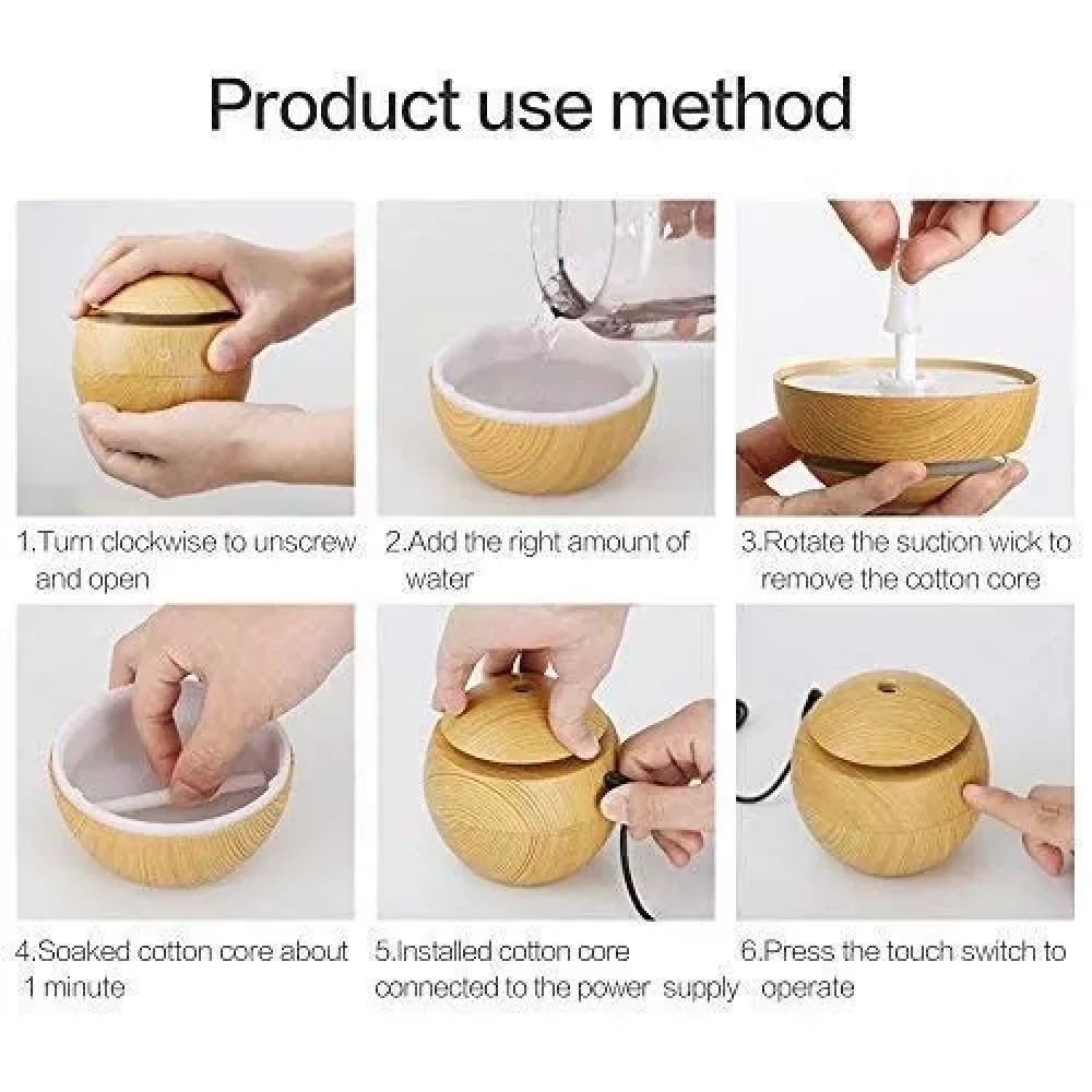 Ameeha Magic Wooden Round Cool Mist Humidifiers Air Diffuser with LED Night Light Colorful Change for Car, Office, Room No Battery Needed. Just fill water with 1-2 drops of aroma perfume and plug in provided micro USB cable with your mobile charging adapter and start use.