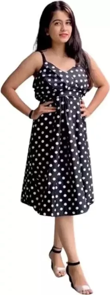 AMEEHA Polycotton Polka Printed Women Ethnic One Piece Sleeveless Black Dress