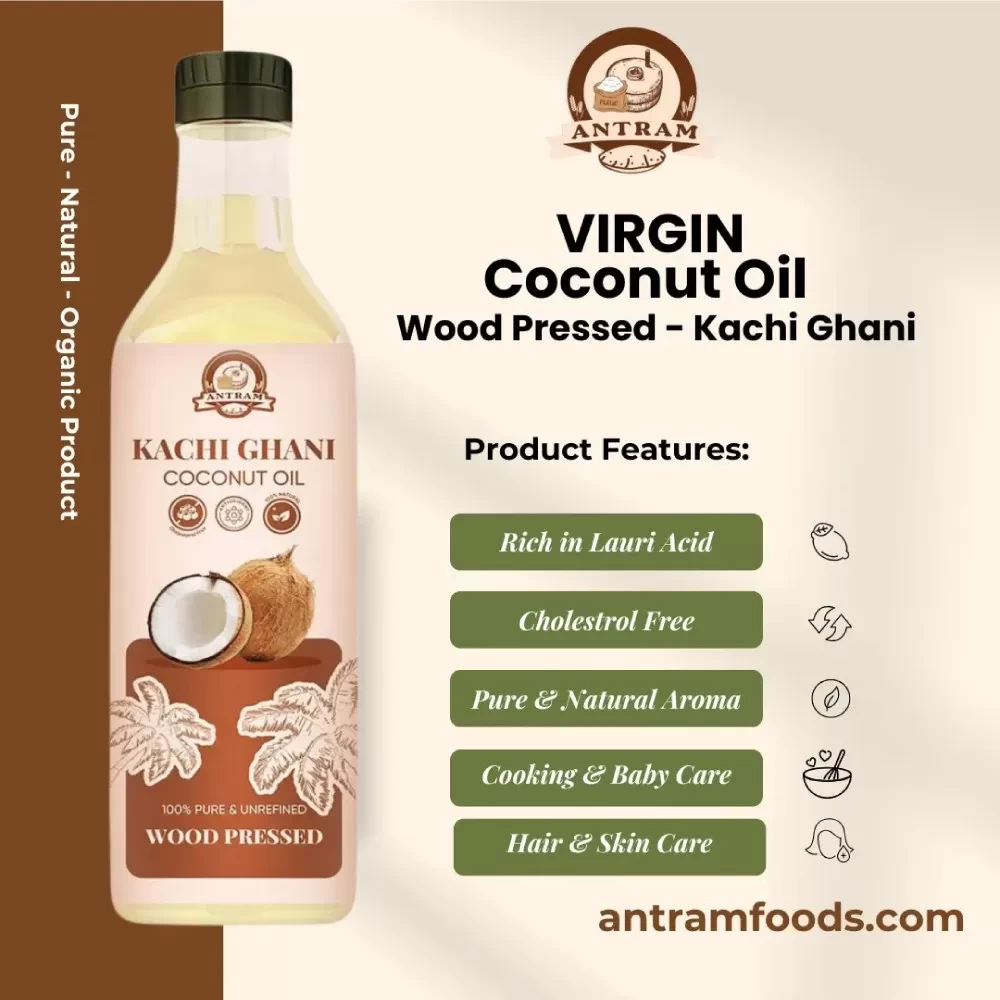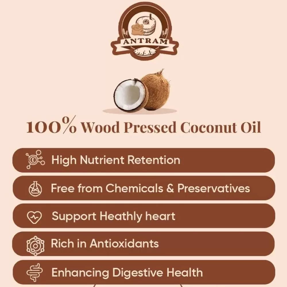 Experience the purity of traditionally extracted coconut oil with Antram Foods’ Wood Pressed Coconut Oil. Made from premium quality coconuts using a slow, cold pressing technique, this oil retains natural aroma, flavor, and nutrients like lauric acid, caprylic acid, and antioxidants, often lost in high-speed processing. Our wood pressing method ensures zero additives, providing you with unrefined, chemical-free coconut oil ideal for cooking, skincare, and hair care. Whether enhancing your meals or enriching your beauty routine, enjoy the full benefits of authentic coconut oil with every drop.