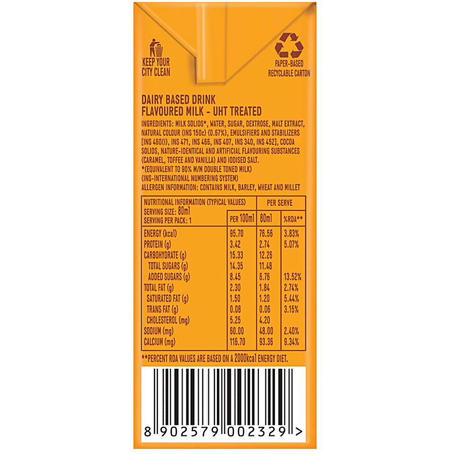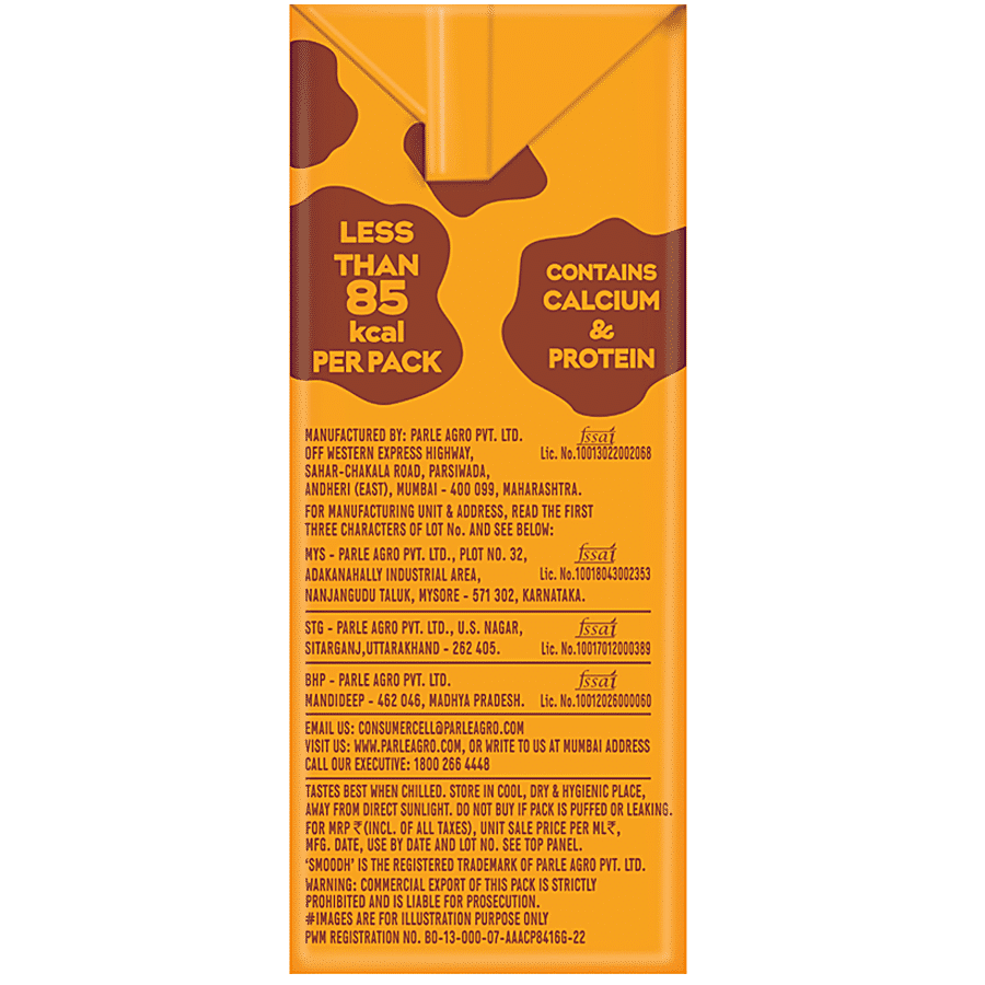 Indulge in the silky, creamy and rich taste of Parle Agro’s flavoured milk range, Smoodh. Smoodh satisfies your craving for a quick, energy-boosting, sweet fix that is absolutely divine. Crafted by combining the finest quality ingredients and goodness of milk, our Smoodh Toffee Caramel Milk Tetra is one such delightful item. It is a deliciously wholesome and nourishing offering that will not just tingle your taste buds but will light up your day in a healthy way. Uht treated flavoured milk. It has a delightful taste of toffee caramel. Naturally high in calcium and protein. Contains all the goodness of pure milk. Super creamy and rich in taste.