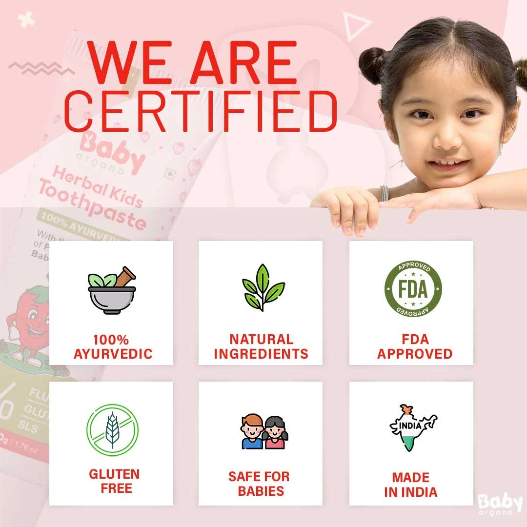 BabyOrgano Ayurvedic Toothpaste is a natural blend of herbal ingredients carefully selected to promote oral health and hygiene of kids. It contains a mild and pleasant flavour that kids will love, making brushing an enjoyable experience. It is a gentle and effective dental care solution designed specifically for children. This specially formulated toothpaste combines the wisdom of Ayurveda with the needs of young smiles.