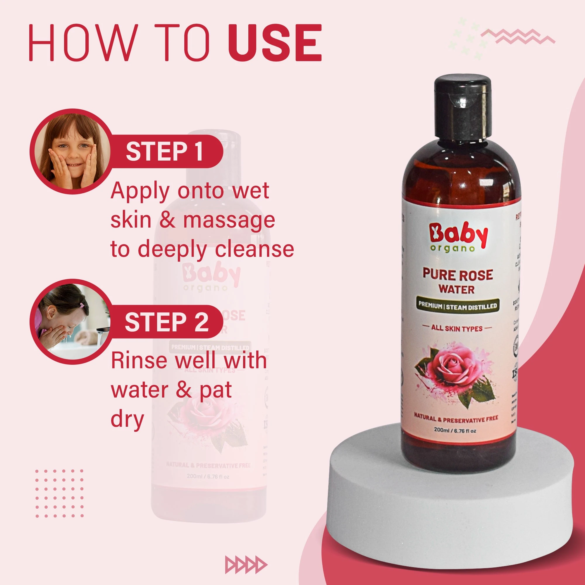 BabyOrgano Pure Rose Water, a gentle and natural way to care for your little ones. This pure and chemical-free rose water is designed with kids keep in mind, harnessing the soothing and refreshing properties of roses to keep their delicate skin and senses pampered and protected.