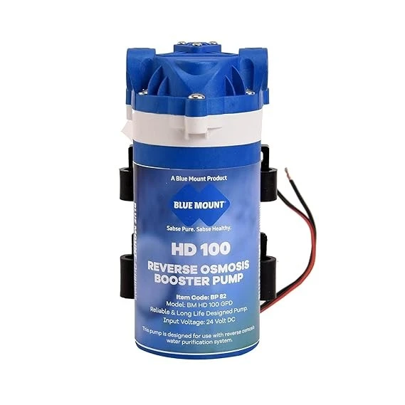 The Blue Mount HD 100 GPD All Metal RO booster pump is designed to enhance the performance of RO/UV/UF water purifiers, whether equipped with or without a storage tank. With a capacity of 100 GPD, it is compatible with various RO water purifiers ranging from 50 to 100 GPD. The package includes one Blue Mount HD 100 GPD Pump, featuring a rust-free powder-coated metal body. This motor is engineered for seamless integration with all types of RO/UV/UF water purifiers. Additionally, it comes with a 1-year replacement warranty, ensuring long-term reliability.