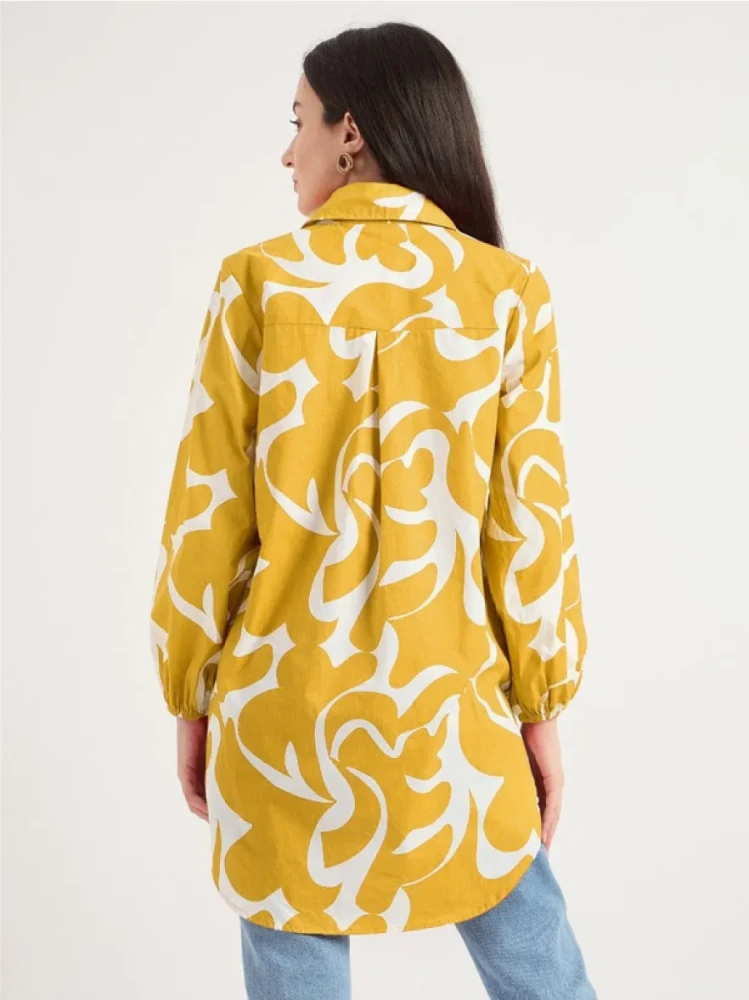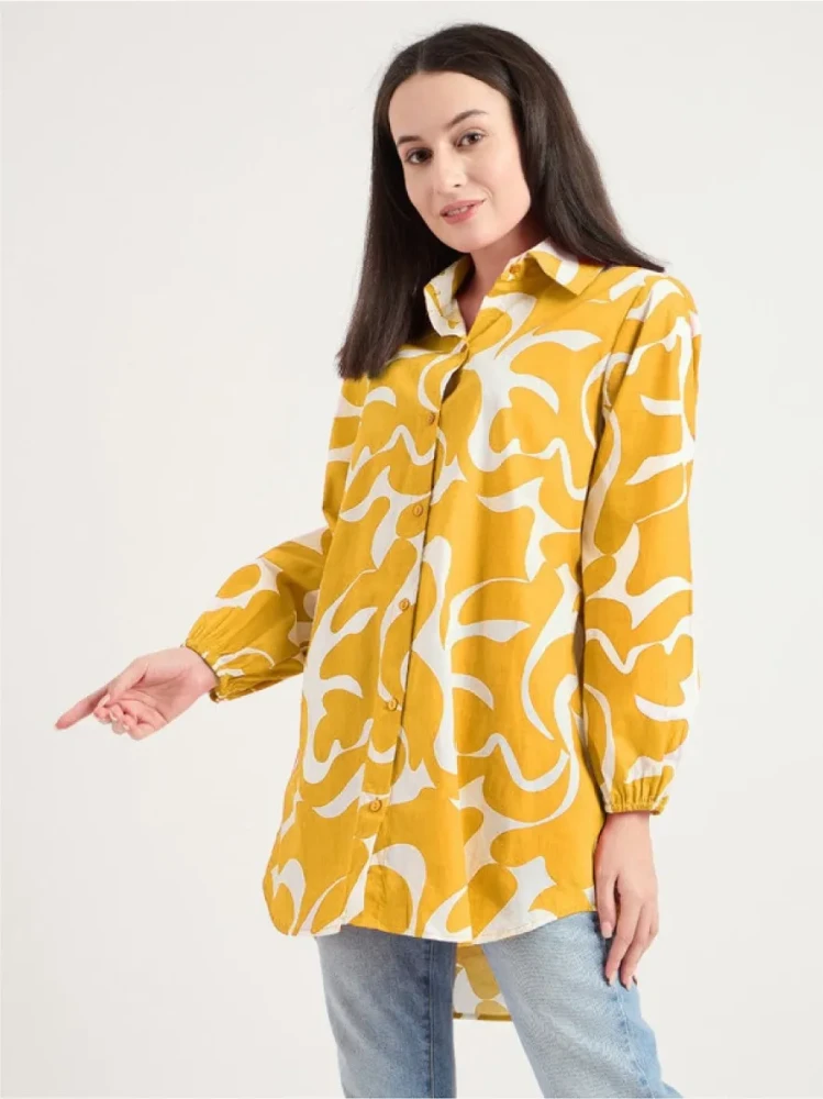 Women Cotton Blend Solid Button Front Yellow Long Shirt Collared Neck Dress